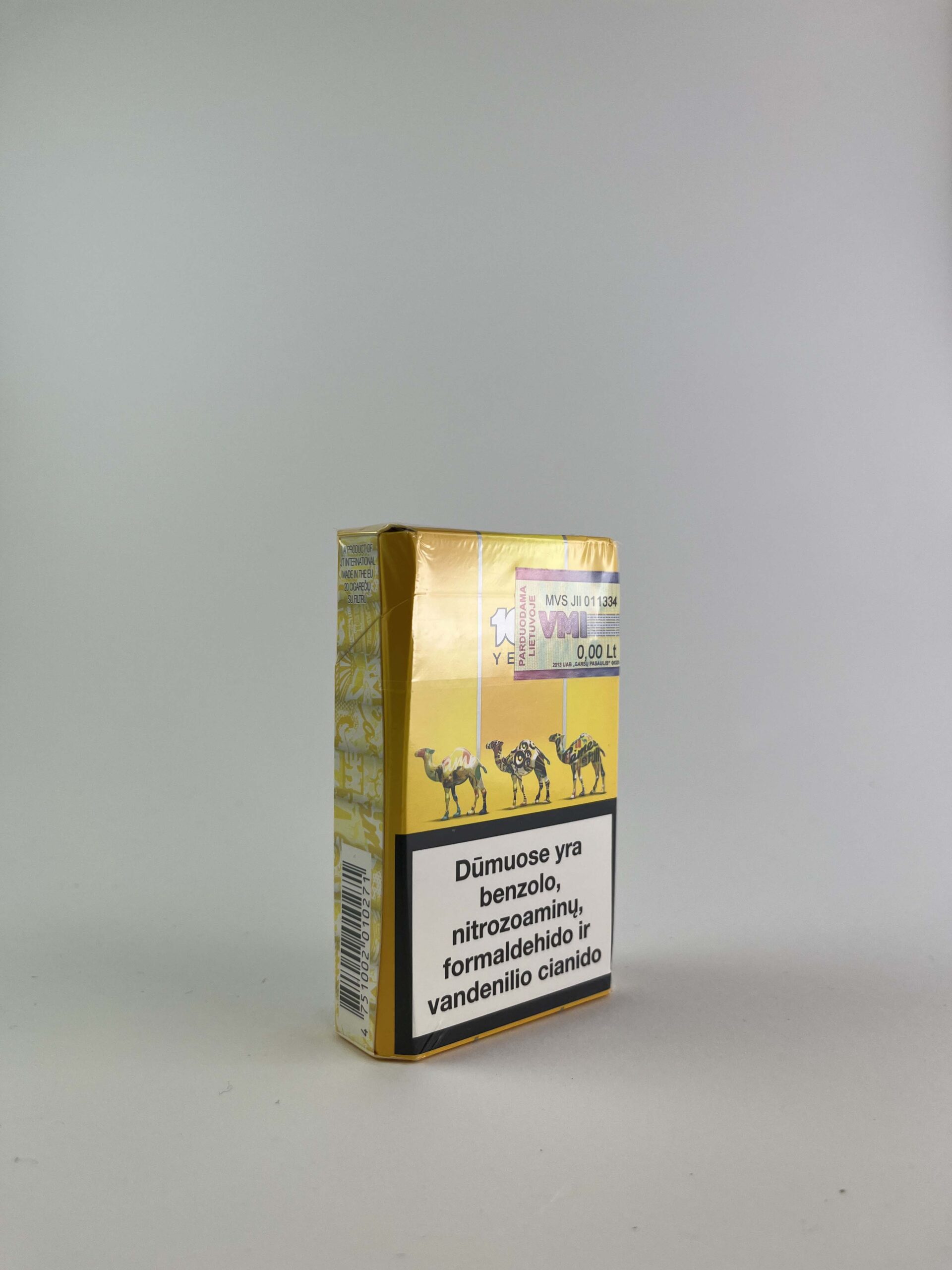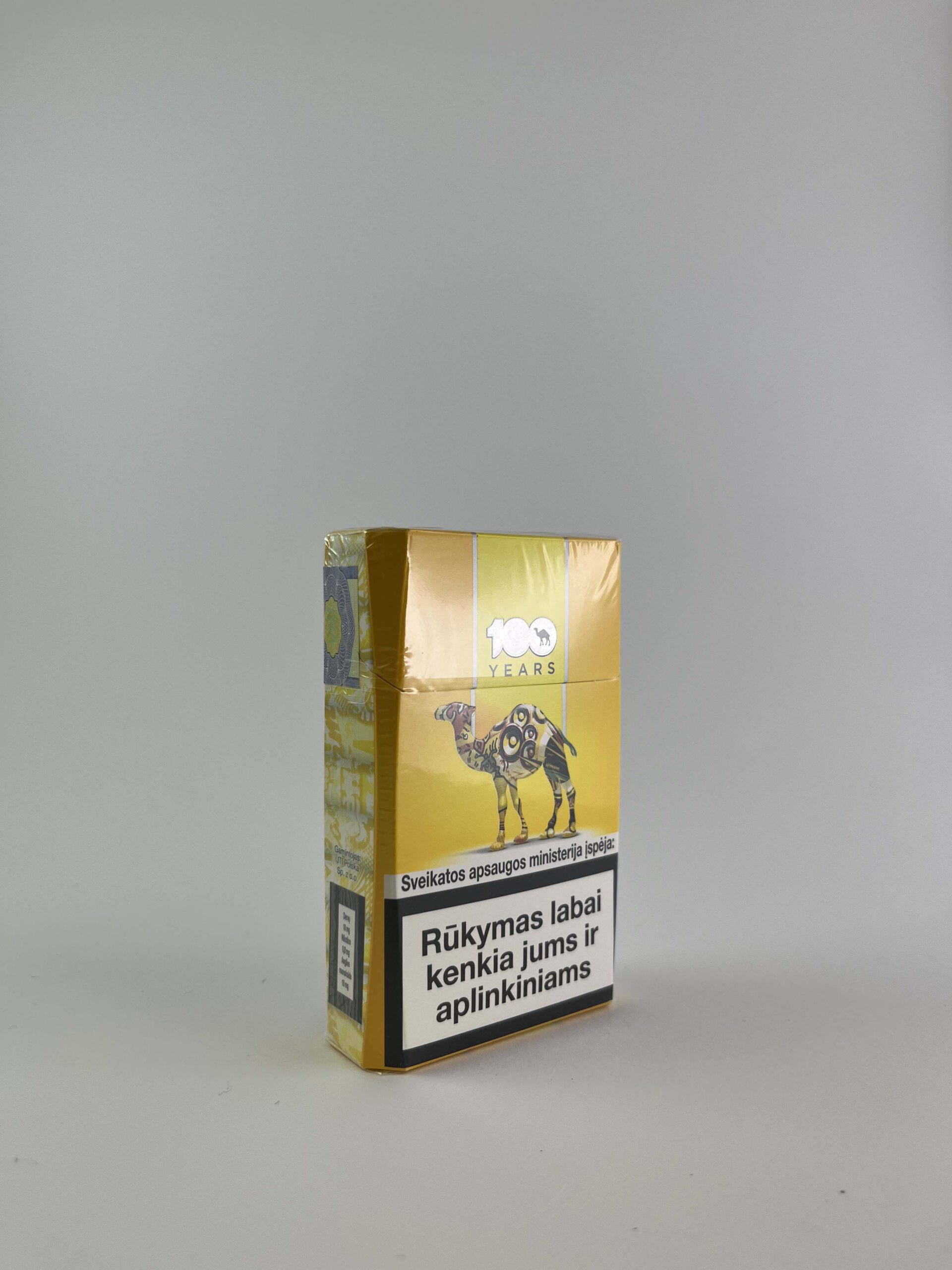Description: Šis Camel pakelis išleistas minint prekinio ženklo 100 metų jubiliejų. Pakelis yra ryškios geltonos spalvos su išskirtiniu dizainu, vaizduojančiu kupranugarį, kuris tapo vienu žinomiausių Camel simbolių. Pakelio priekyje didelė įspėjamoji žinutė apie rūkymo žalą sveikatai, o antroje pusėje pateikta informacija apie cigarečių dūmuose esančias kenksmingas medžiagas. Specialus leidimas ir jubiliejinis dizainas padidina šio pakelio vertę kolekcininkų tarpe.