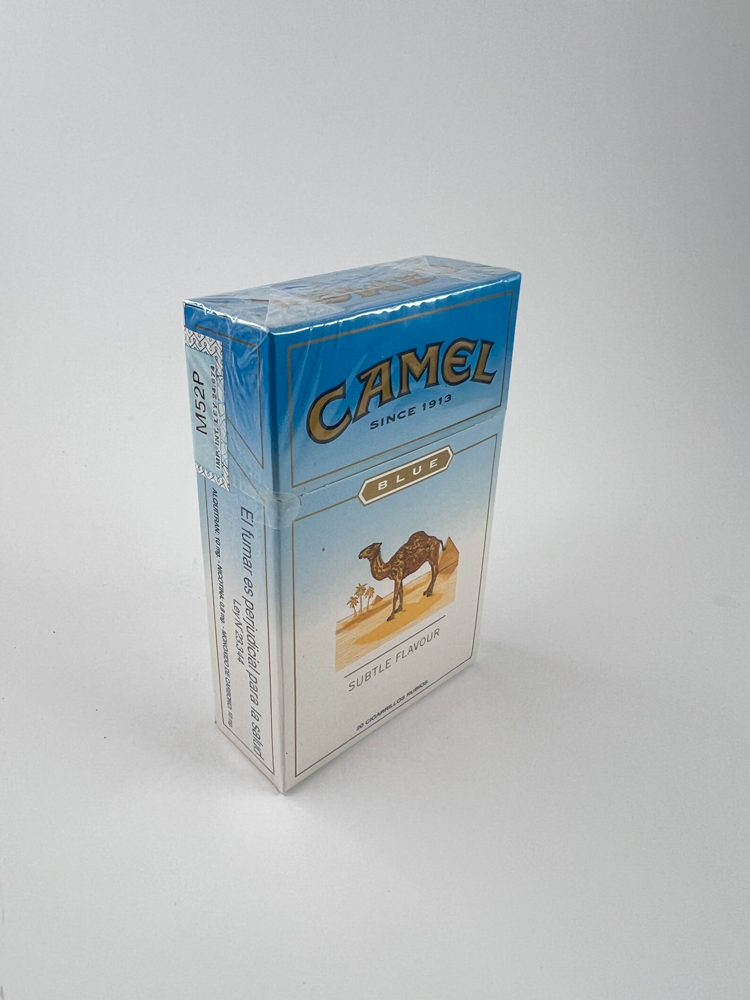 Description: This Camel Blue cigarette pack has a subtle and clean design, featuring a blue and white colour combination. The front features the classic camel in the desert, the iconic symbol of the brand. The top reads „Since 1913“ and the flavour below reads „Subtle Flavour“. The back features an English description of the tobacco quality, which is typical of many Camel packs. The warnings are in Spanish and the top features the original Spanish excise stamp.