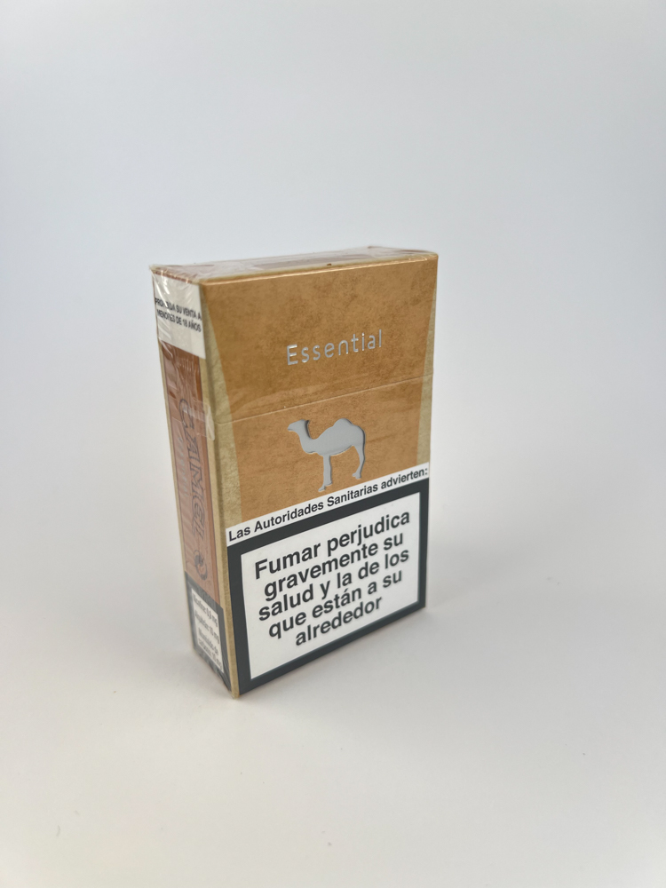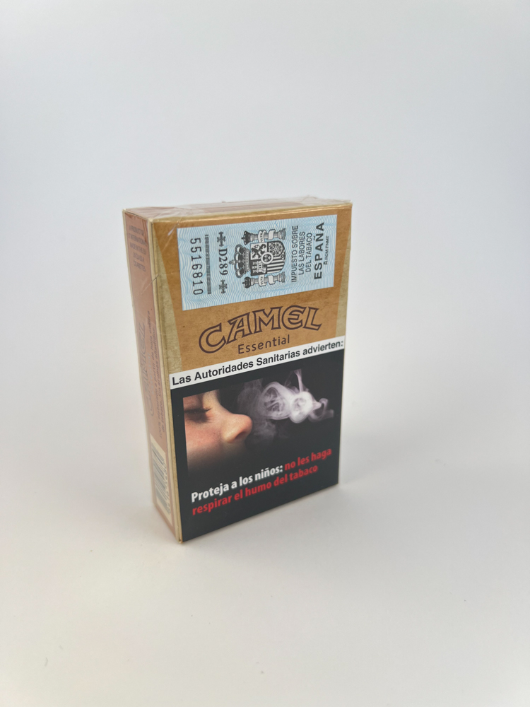Description: This pack of Camel Essential cigarettes features a minimalist design with a natural cardboard color that symbolizes "simplicity" and "naturalness". The front side features the word "Essential" in white font and a prominent white camel figure. The other side clearly displays the Camel Essential brand. The health warnings are in Spanish: with a text message on the front and graphic illustrations on the back. The Spanish excise stamp is visible at the top, indicating that the product is official for the local market.
