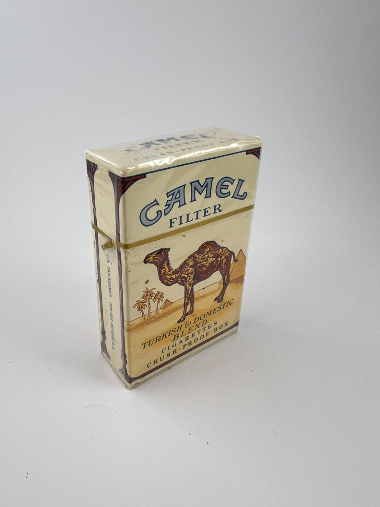 This is a classic Camel Filter pack with an authentic camel motif on a desert background, preserving the old style with the inscription "Turkish & Domestic Blend" and "Crush-proof box". The back contains text about not using product coupons and emphasizes the high-quality tobacco blend. An important element is the blue inscription "US Tax Exempt For Use Outside US", which allows you to identify this pack as intended for export, often used in the context of US military or diplomatic supplies. At the bottom - "Made in USA" and manufacturer: RJ Reynolds Tobacco Co.