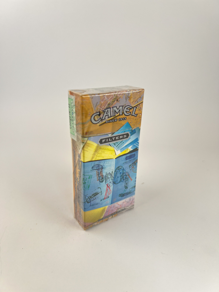 The package stands out with bright, based on map and travel documents – the background shows a stylized city map, travel stamps, visa stamps, and names of world cities.