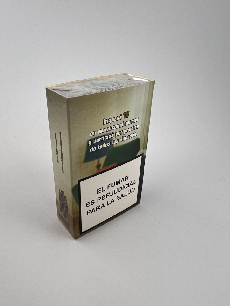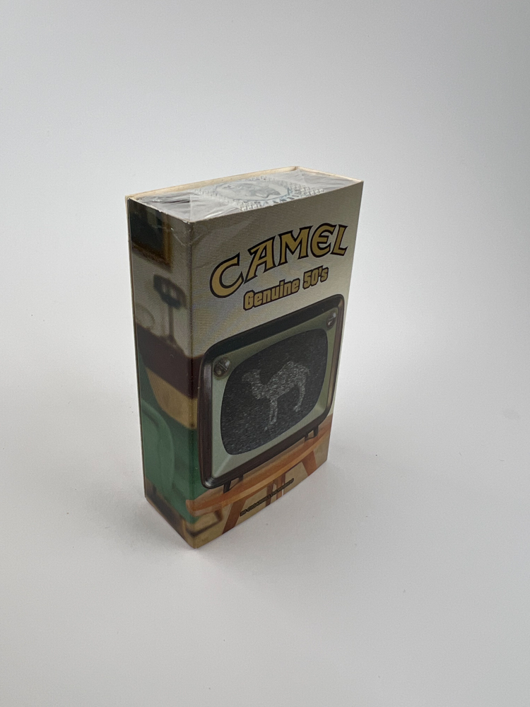 Description: Tai vienas iš „Camel Decades“ serijos pakelių – 50-ųjų tematikos variantas. Dizainas vaizduoja senovinį televizorių su klasikiniu Camel simboliu, perteikiant pokario Amerikos estetiką ir ankstyvosios masinės medijos laikotarpį.
