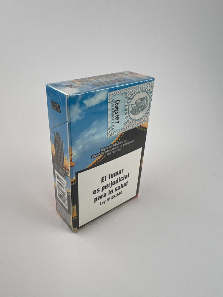 Description: Tai alternatyvi Camel „Genuine Beijing” pakelio versija iš „Camel Genuine Cities“ kolekcijos, skirta Argentinos rinkai. Dizainas labai artimas kitai „Beijing“ versijai, tačiau šio pakelio priekinėje pusėje dominuoja ryškesnės spalvos su didesniu raudonos ir oranžinės spalvų intensyvumu, o šešėlyje integruotas kupranugario siluetas labiau kontrastuoja. Nugarėlėje – ispanų kalba pateiktas sveikatos įspėjimas, reklaminis kvietimas dalyvauti loterijoje Camel puslapyje ir Argentinos akcizo žyma. Tai rodo, kad pakelis priklauso tam pačiam rinkodaros laikotarpiui, bet vizualiai išskirtas kaip paralelinis dizaino variantas.
