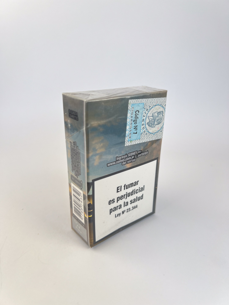 This Camel Genuine Sidney pack is part of the limited edition Camel Cities Collection, dedicated to cities around the world. The design features the Sydney Opera House, one of Australia's most recognizable symbols, illuminated in the evening with a warm reflection of the sea in the background. Above: CAMEL logo and inscription Genuine Sidney, and a call to visit the website is visible on the side camel.com.ar and participate in the lottery - this is confirmed by the license issued specifically for the Argentine market.