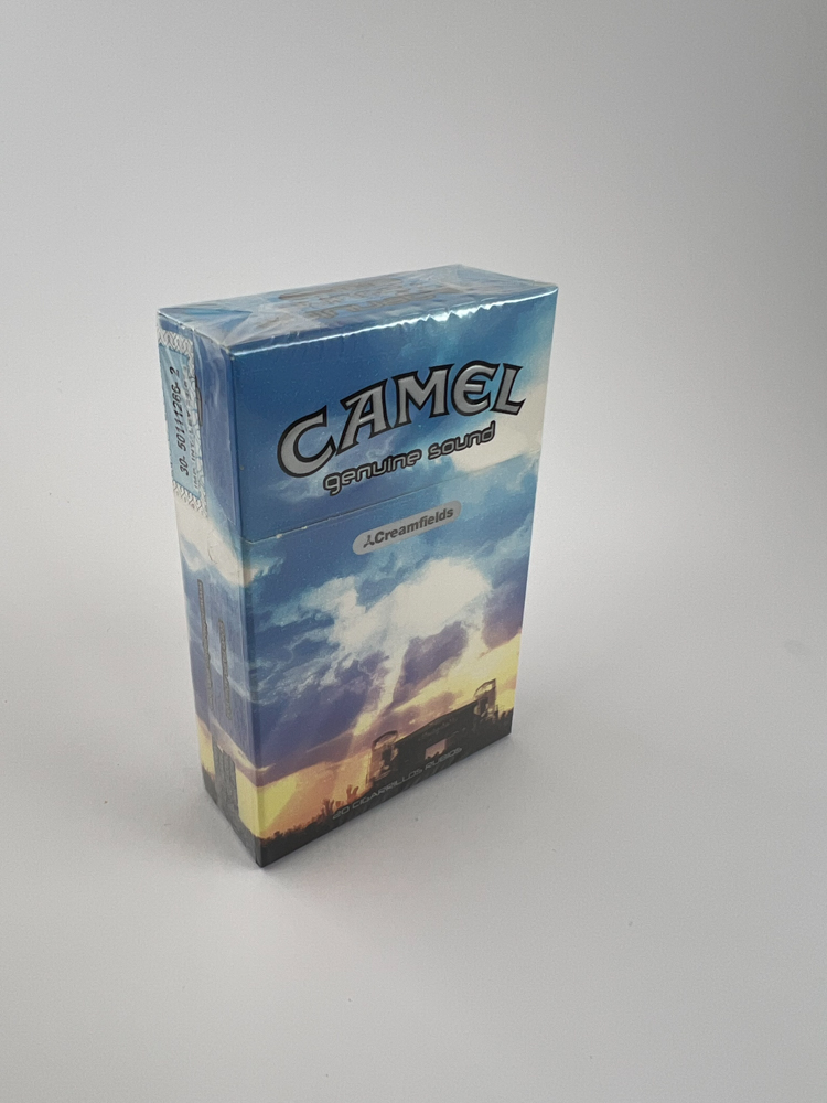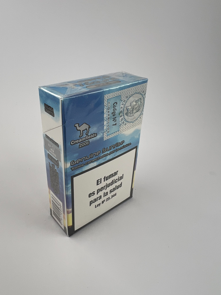 This is a limited edition pack of Camel cigarettes, released to celebrate the 2006 Creamfields International Electronic Music Festival in Argentina. The light version of the pack features a lighter sky and clouds, conveying the mood of an early morning sunrise. The front features the words "Camel Genuine Sound" and "Creamfields", while the back features the phrase "Todos conectados por la música" ("All connected through music"). This release was intended for the local market only, and this light version is less common than its darker counterpart.