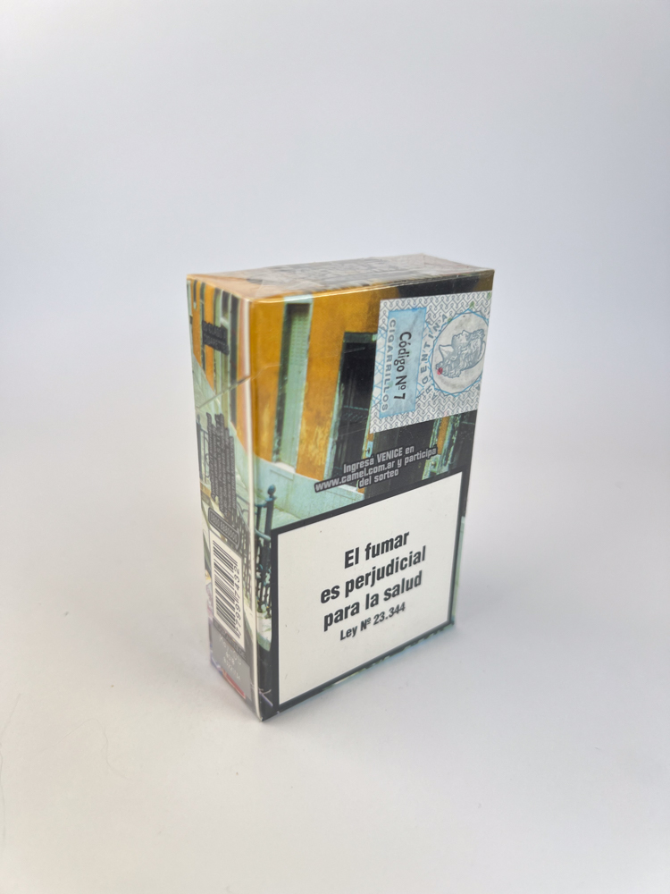 Above – CAMEL Genuine Venice logo, and in the background – a realistically rendered fragment of the city, creating the effect of the shine of the water surface. On the side – text “Imported by Massalin Particulares SA”, indicating that this release is intended for the Argentine market.