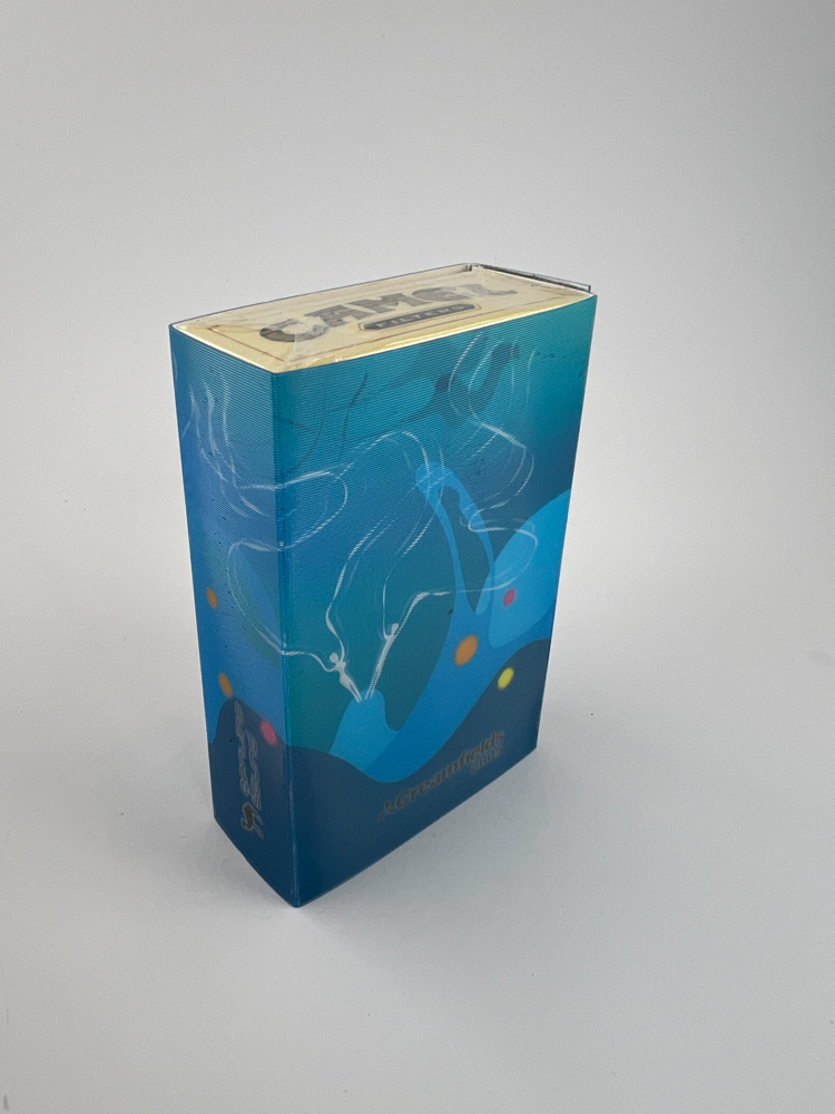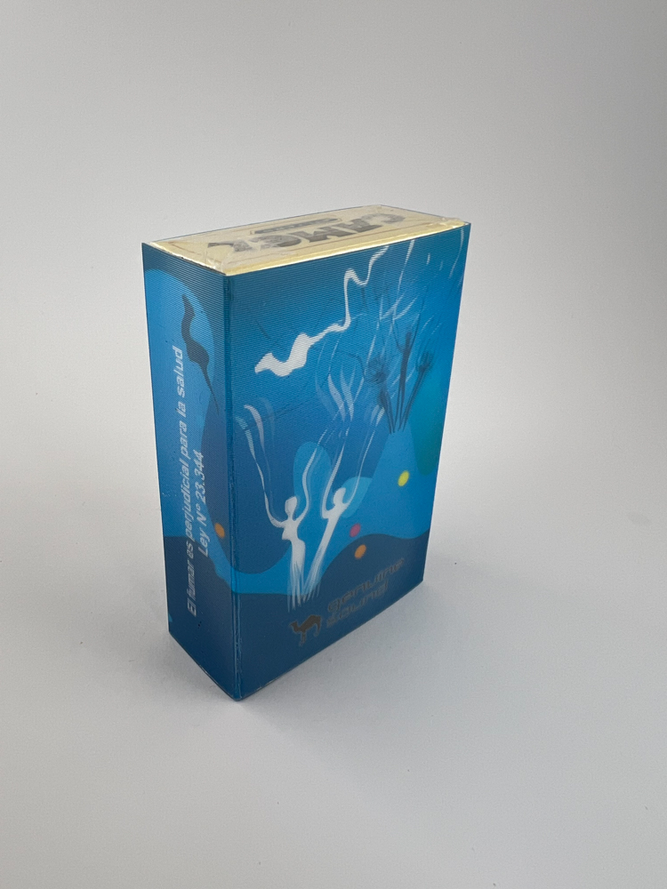 Description: This is a limited edition pack of Camel La Comunidad 2000 cigarettes, released in Spain as a special artistic series. The pack is distinguished by its blue background and colorful abstract figures reminiscent of human silhouettes and smoke motifs. The Camel Comunidad de Madrid logo is marked at the bottom, indicating regional exclusivity. On the side is a warning in Spanish, in accordance with the laws in force at the time. This edition was intended for an advertising or cultural campaign, and is therefore considered a rare collector's item today.