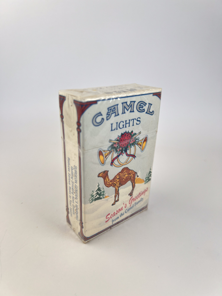 This is one of the rarer and more sought-after Camel limited editions – a festive package with a note “"Season's Greetings from the Camel Family"”. The front features a classic camel standing in a snowy winter landscape with fir trees in the background and a decorative Christmas wreath and two trumpet-shaped ornaments on top. The design is kept in a retro style, typical of the Camel aesthetic of the late 80s and early 90s.