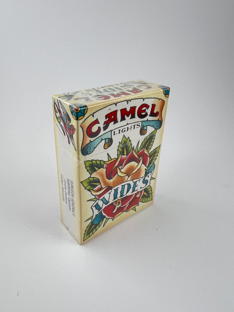 This Camel Lights Wides pack is part of a limited edition artist series created in collaboration with tattoo artist Scott Campbell. The pack design is reminiscent of old school tattoo style, decorated with a bright rose and ribbon pattern with the inscription "WIDES". The back contains information about Scott Campbell's biography, his activities in New York and his artistic direction. The pack is intended for the US market, it does not have health warnings like in Europe, but has an original design with an artistic accent. Condition - undamaged, in the original film.