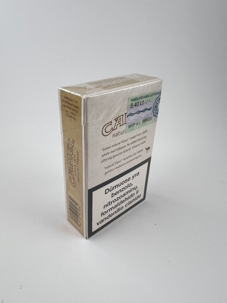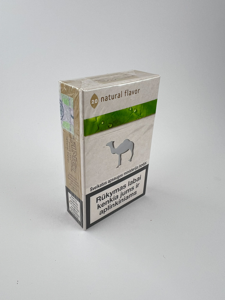 Camel „Natural Flavor” cigarečių pakelis pasižymi natūraliu ir minimalistiniu dizainu. Šviesi pakuotė su žaliu lapo motyvu perteikia gamtinių, neperdirbtų savybių įvaizdį. Pagrindinis akcentas – kupranugario logotipas, tipiškas Camel prekės ženklui, ir užrašas „natural flavor“, pabrėžiantis be papildomų kvapiųjų medžiagų pagamintą tabaką. Pusėje nurodyta sudėtis: 100 % „whole-leaf“ tabakas, be pridėtinio kvapo, mažesnio kenksmingumo įvaizdis. Lietuviškas įspėjimas apie rūkymo žalą rodo, kad pakelis skirtas Lietuvos rinkai. Ant viršaus yra akcizo lipdukas su kaina 8,40 Lt.