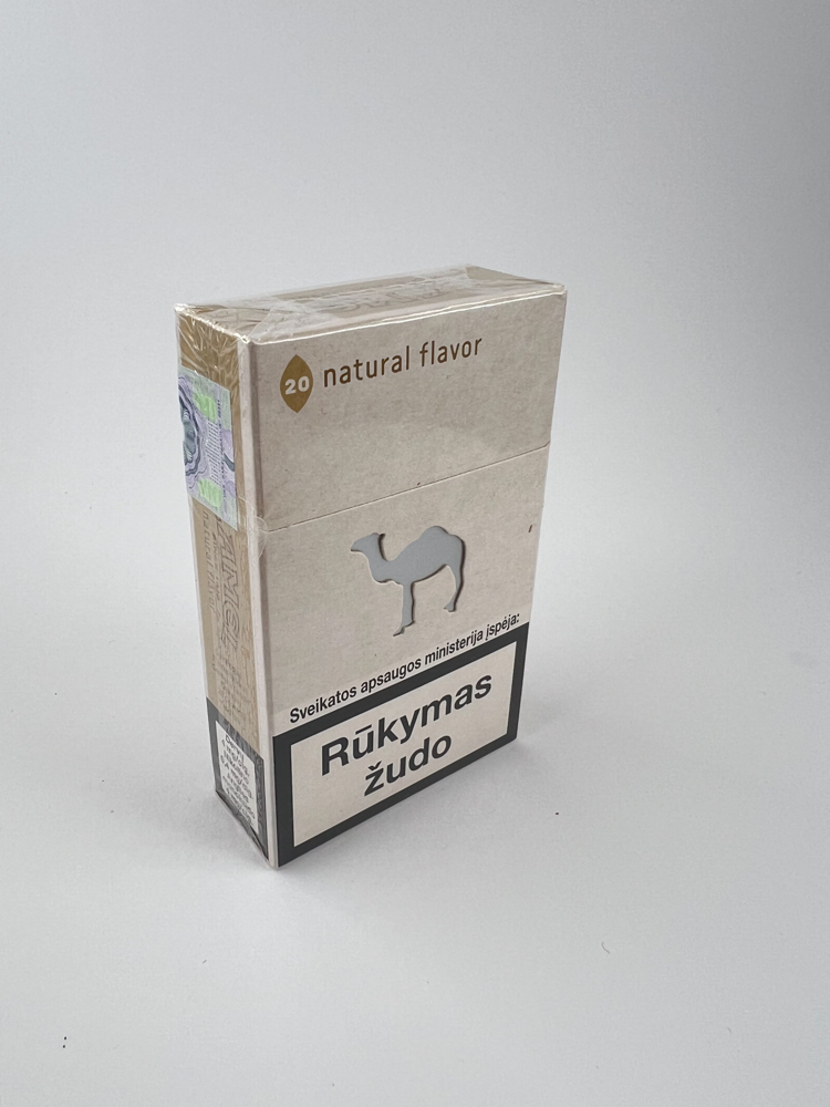 This is an alternative design Camel „Natural Flavor” cigarette pack, featuring a light, natural design without bright colors, emphasizing the „naturalness“ of the product. The front side features a camel silhouette, the inscription „natural flavor“ and the classic warning from the Ministry of Health in Lithuanian „Smoking kills“. The back side contains information about the product’s composition – no flavorings, 100 % „whole-leaf“ tobacco is used. The excise sticker with the price of LTL 6.40 indicates that the pack was sold in Lithuania before the introduction of the euro. Condition – perfect, film not damaged.
