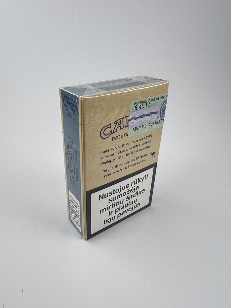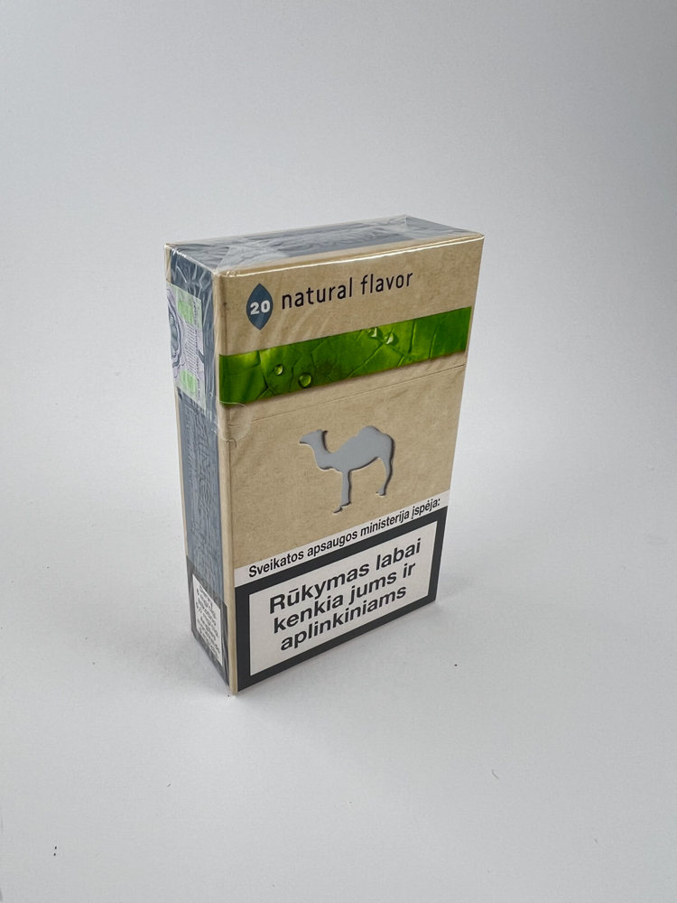 Šis Camel „Natural Flavor” cigarečių pakelis pasižymi šviesiu natūraliu dizainu su žaliu lapo motyvu, pabrėžiančiu „be kvapiklių“ tabako įvaizdį. Pakuotė skirta Lietuvos rinkai, kaip rodo lietuvių kalbos įspėjimai bei akcizo lipdukas su kaina 8,40 Lt. Ant pakuotės pažymėta, kad naudojamas 100 % „whole-leaf“ tabakas, be pridėtinių skoninių medžiagų. Kupranugario siluetas centre išlaiko Camel prekinio ženklo tapatumą. Pakelis – nepažeistas, originalioje plėvelėje.