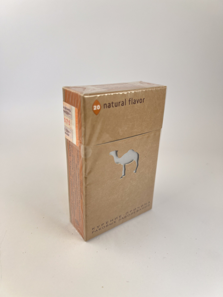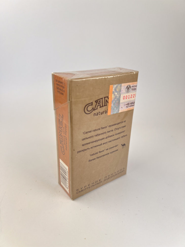 This edition of Camel Natural Flavor features a warm, natural brown packaging that reflects the tones of the raw tobacco. The design is minimalist – a matte surface, a silver camel logo in the center and a small inscription natural flavor top. On the back there is a text in Russian, explaining that the product does not contain flavoring additives, and the tobacco used is natural, from the whole leaf. On the top there is an orange Russian excise stamp with a holographic security element. Visually, the pack maintains a modern, eco-style impression, contrasting with the traditional Camel identity.