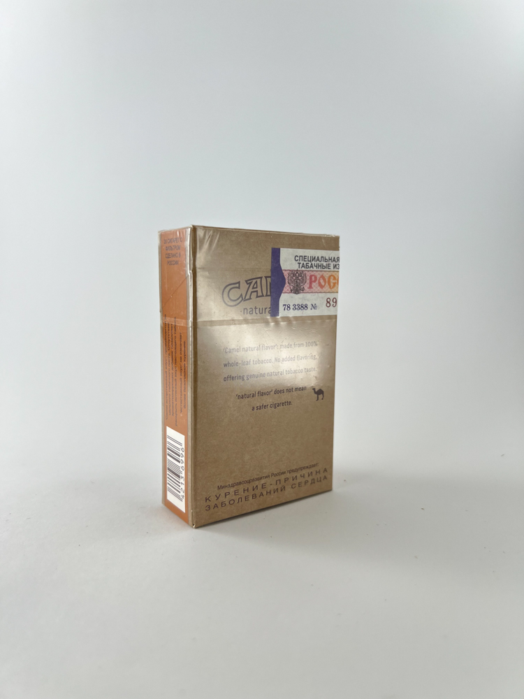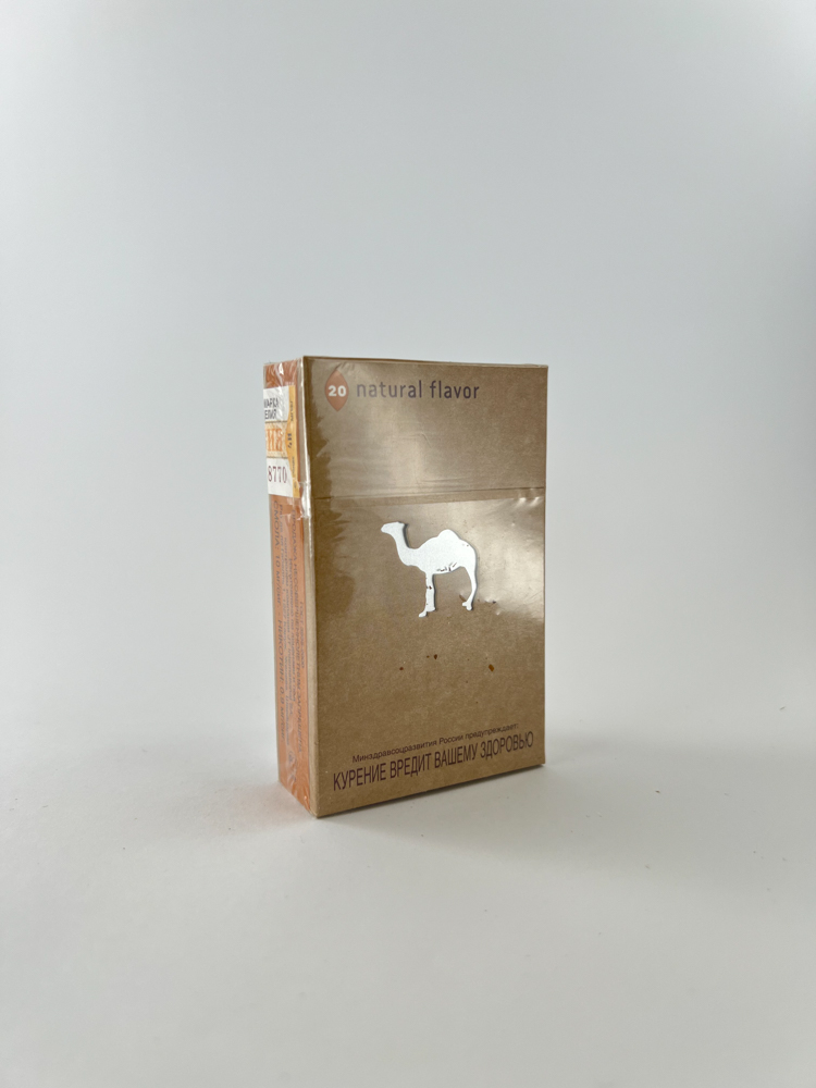 This Camel series pack is distinguished by its minimalist and naturalistic design – a matte brown background decorated with a white camel silhouette. The inscription „natural flavor“ refers to a product made without additional flavorings – this was Camel’s attempt to present the idea of a „real tobacco“ taste. The back side states: „"100% whole-leaf tobacco, no added flavoring"“, thus emphasizing the concept of authenticity and naturalness.