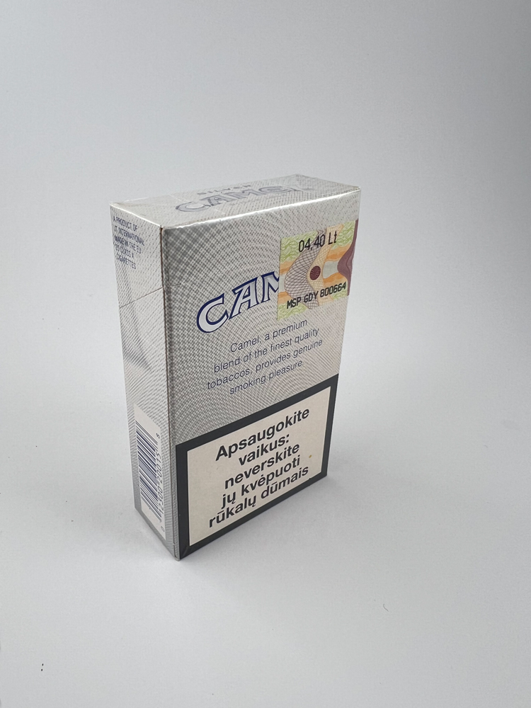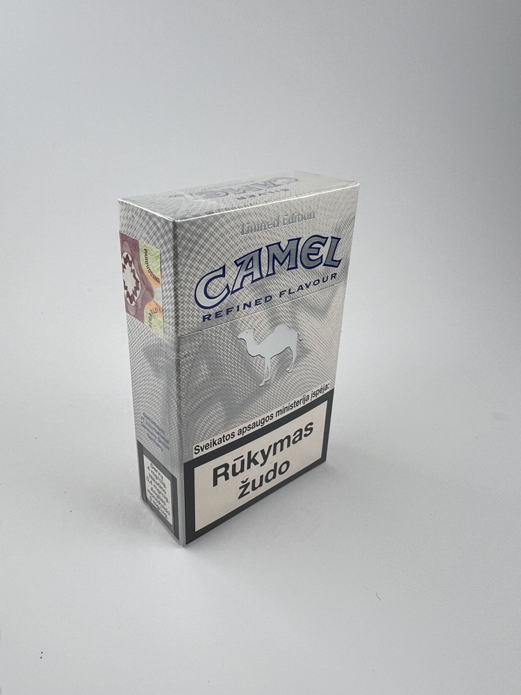 Description: Šis „Camel Refined Flavour“ cigarečių pakelis yra riboto leidimo versija, pasižyminti moderniu, sidabriniu languotu dizainu su aiškiai pažymėtu „Limited Edition“ virš logotipo. Baltas kupranugaris išlieka pagrindiniu grafinės tapatybės simboliu. Priekinėje ir galinėje dalyje aiškiai matomi įspėjimai lietuvių kalba, o pakelio viršuje išlikusi senoji Lietuvos akcizo banderolė su kaina – 4,40 Lt. Nugarinėje pusėje pateiktas klasikinis „Camel“ aprašymas anglų kalba. Pakelis idealiai išsaugotas su nepažeista plėvele.