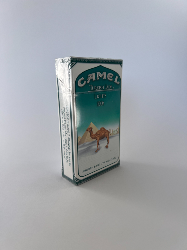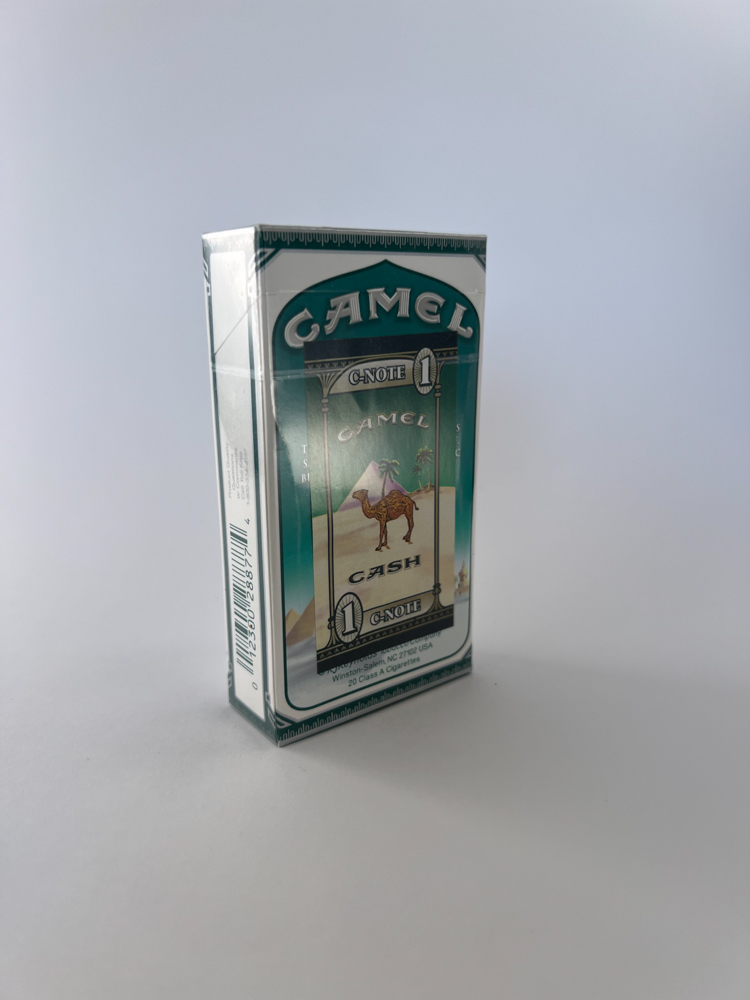 This pack of Camel Turkish Jade Lights 100's is part of one of Camel's most unique and visually distinctive lines of releases - the C-Note (Cash Note) collection. The front side features the classic Camel camel on an Egyptian background with the words "Smooth & Mellow Menthol", while the back side of the pack is decorated as a stylized dollar bill marked "C-Note", "CASH" and a camel in a frame - this was an advertising campaign with the theme of money and luxury.