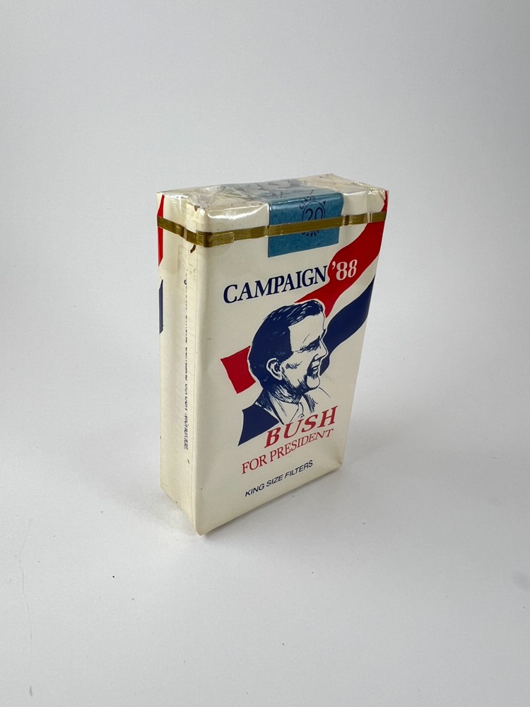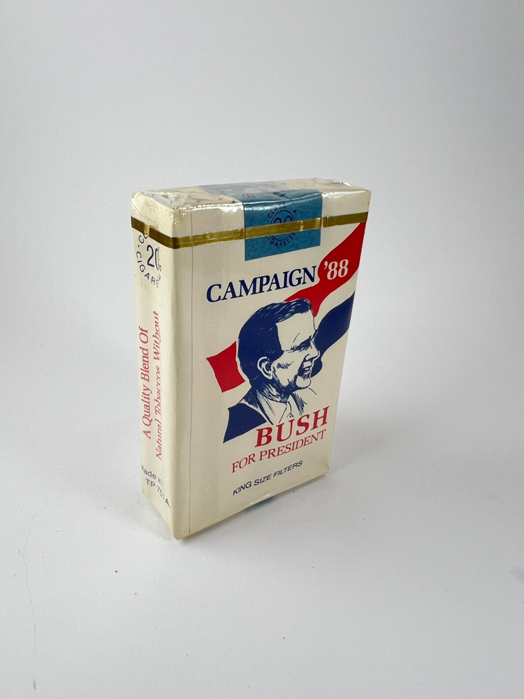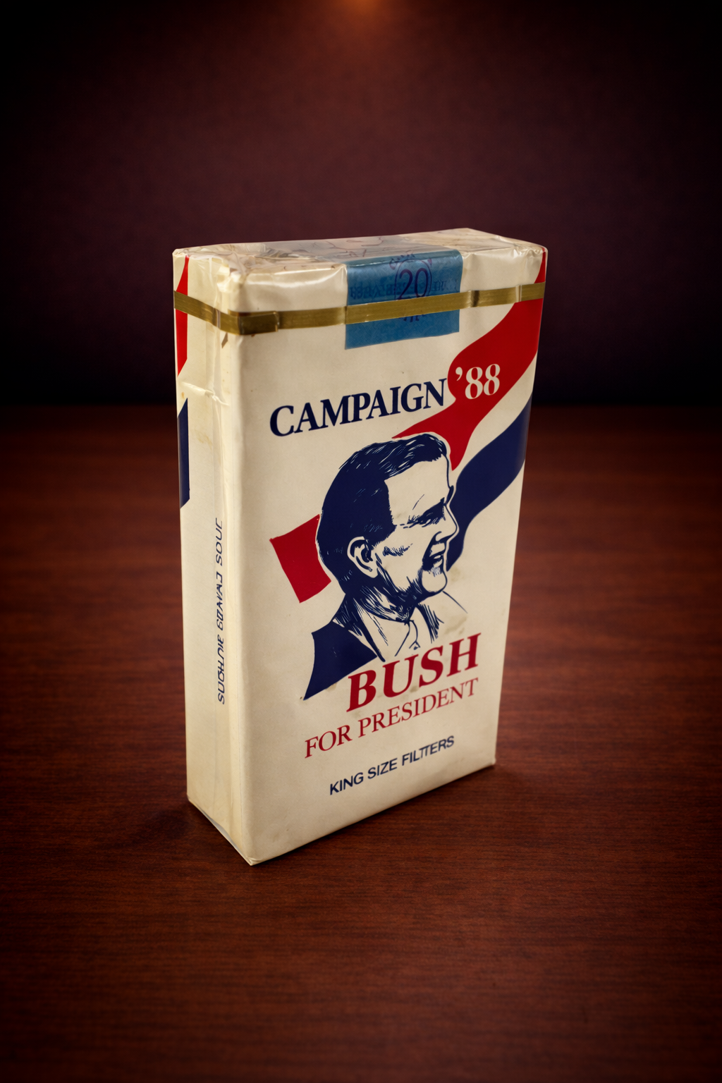 Description: This cigarette pack is an exclusive souvenir edition created during the 1988 George HW Bush presidential campaign. The pack features a minimalist but striking design – a white background, a stylized US flag motif and a portrait of George HW Bush with the inscription „Bush for President“. These are not standard commercial cigarettes, but a limited edition promotional publication dedicated to a political campaign. Such a pack today is a rare historical artifact with political and collectible value.