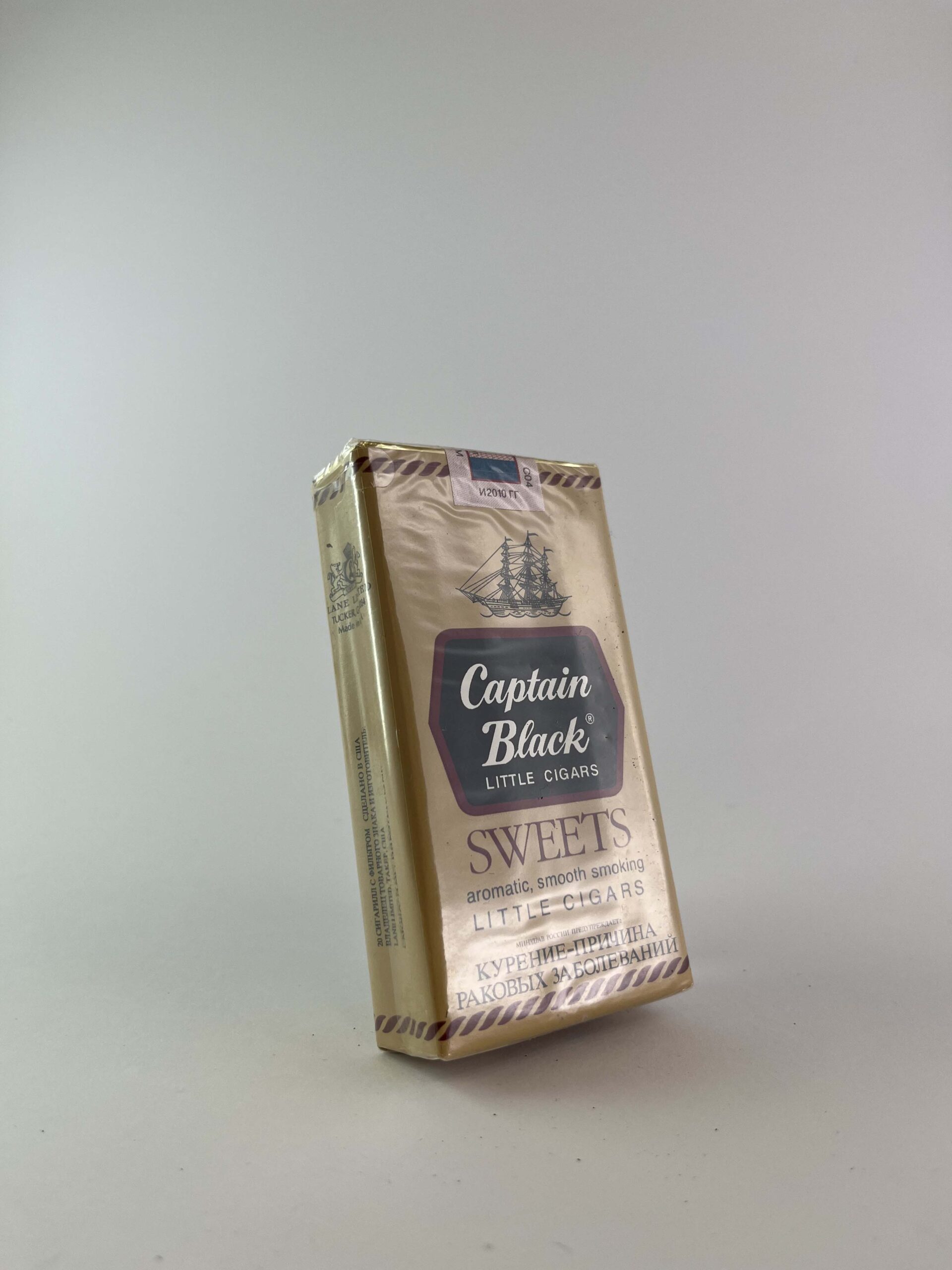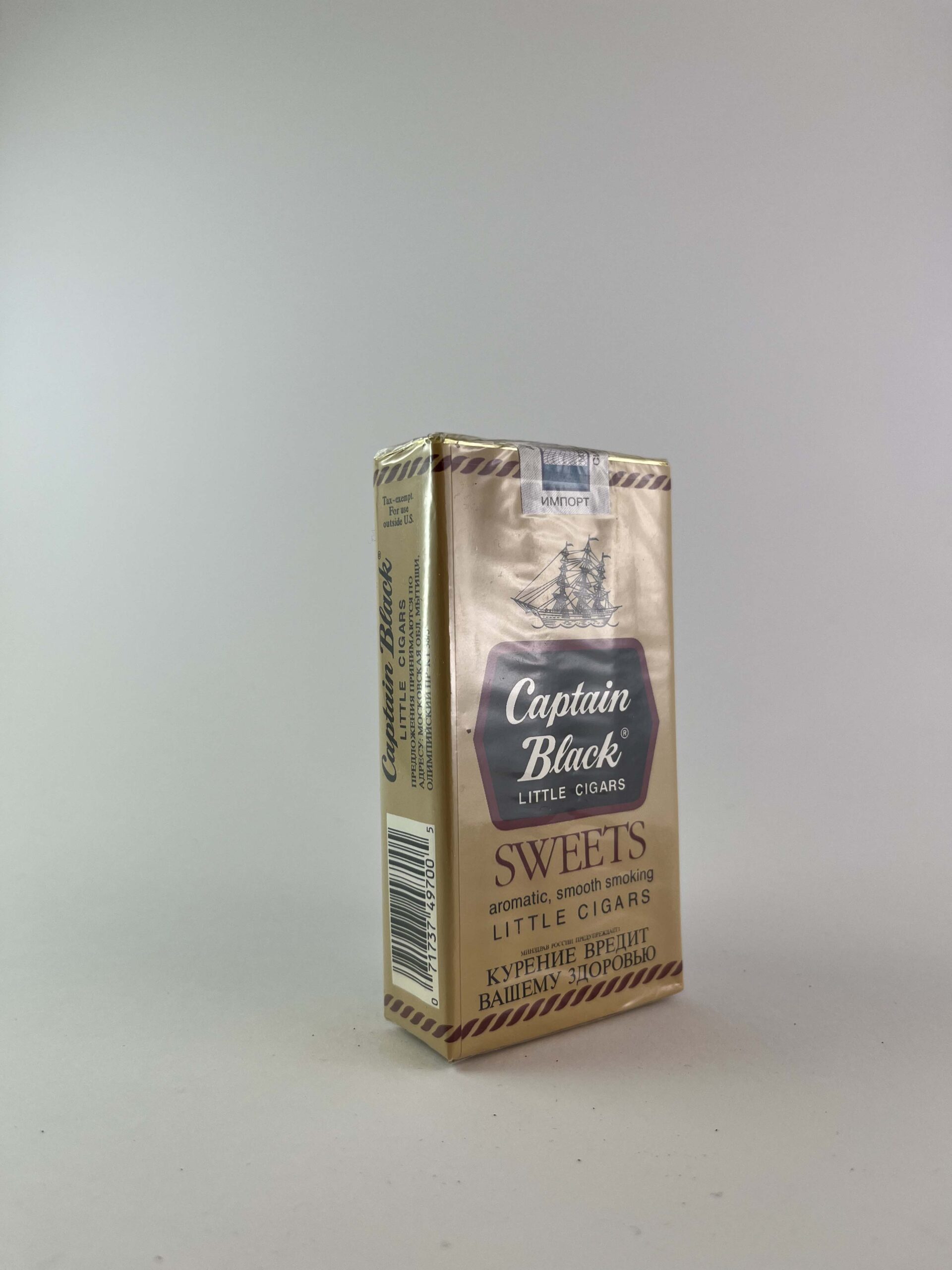 The Captain Black „Sweets” cigarillo pack features classic design elements dominated by gold and brown colors. The front of the pack features a ship, and the name „Captain Black” is highlighted on a black background. The cigarillos are designed for aromatic and smooth smoking, and the „Sweets“ edition has a sweet taste that creates a pleasant smoke sensation. At the bottom of the pack is a prominent warning in Russian indicating the health risks of smoking.