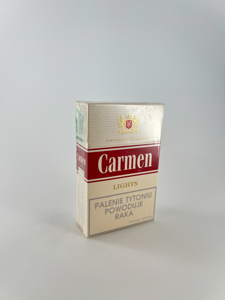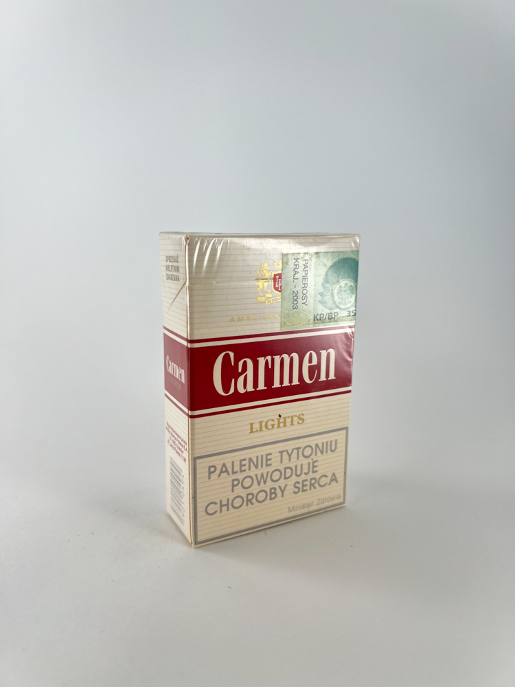 • Historical data and popularity: „Carmen“ cigaretės buvo gana plačiai platinamos Rytų Europos rinkose, bet retai išsilaikė iki šių dienų nepažeistoje būklėje. Šis konkretus „Lights“ variantas iš 2003 metų su klasikinio tipo dizainu šiandien rinkoje sutinkamas gana retai.