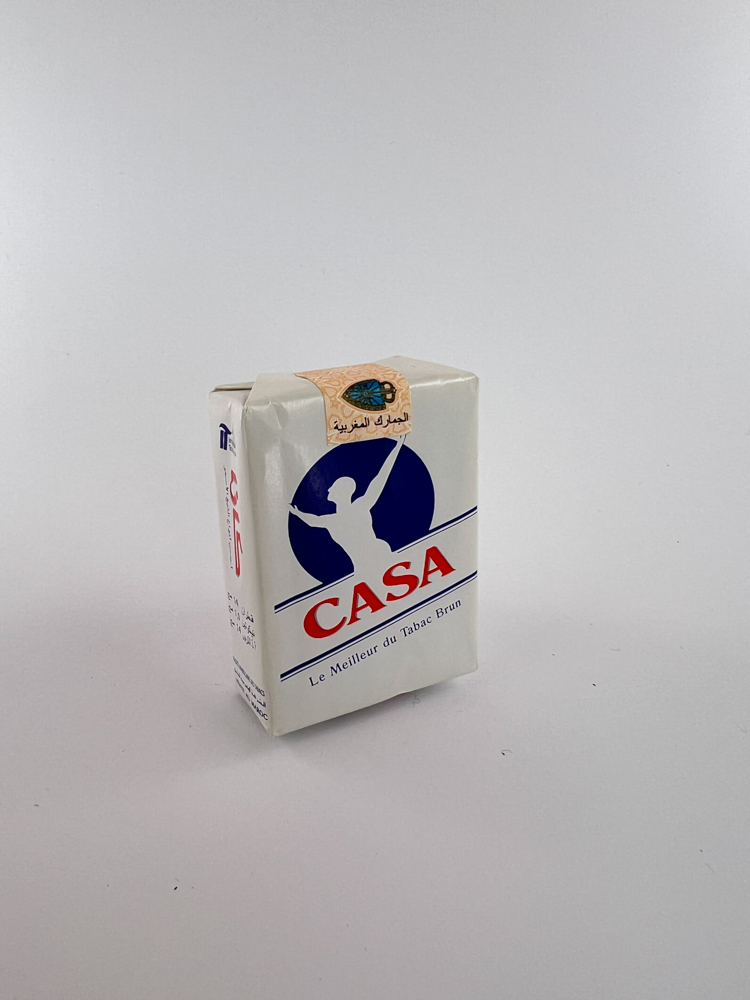 „The CASA cigarette pack is a minimalist soft pack with a white background, a bright blue circle with a silhouette of a man holding a torch, and the red inscription "CASA". On one side is the text in Arabic, on the other - in French: "Le Meilleur du Tabac Brun" (The Best Brown Tobacco). The top clearly shows Moroccan Customs (Douanes Marocaines) sticker, confirming local origin and distribution. The warning about the harms of smoking is provided in both Arabic and French.
