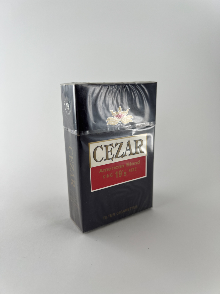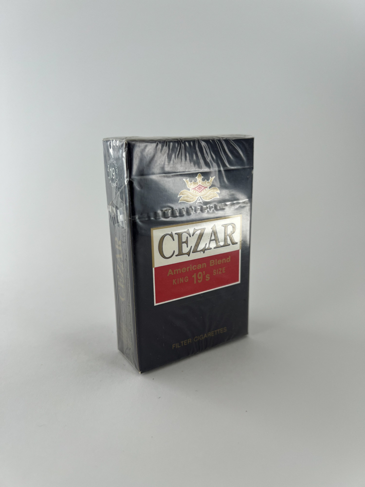 „Cezar is a lesser-known cigarette brand that, based on its visual style and the frequent use of the phrase "American Blend," was likely intended for export or non-EU markets. The dark, luxury-imitation design with its red-gold combination and crown above the name are associated with prestige. An interesting detail is that the pack contains 19 cigarettes, which is unusual and could be used for tax or marketing purposes.