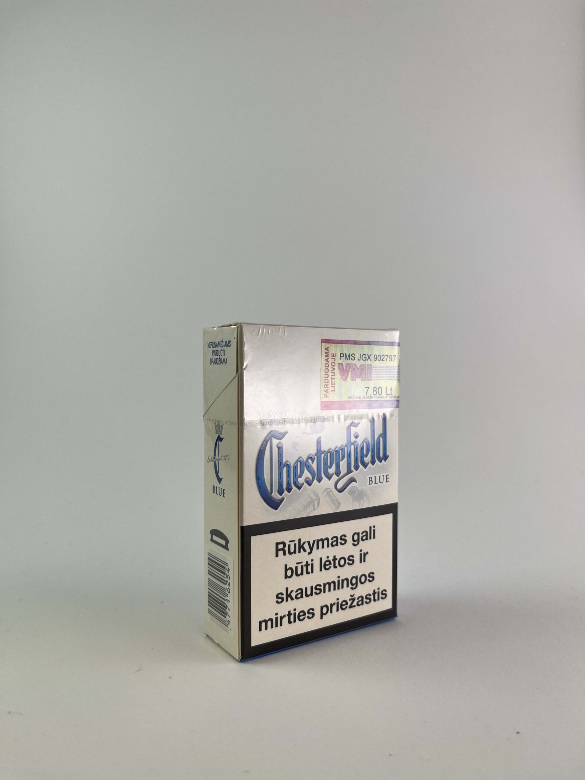 Description: Chesterfield Blue cigarette pack with the classic blue Chesterfield logo and crown symbol. The pack features the traditional health warnings that were common at the time.