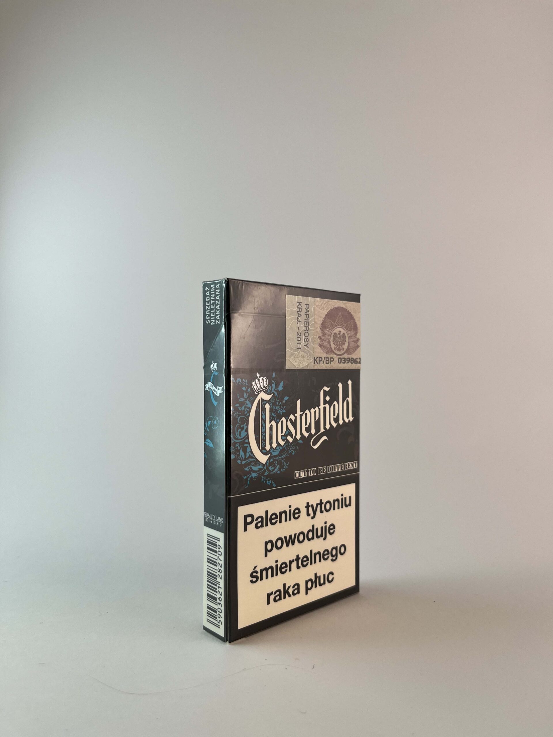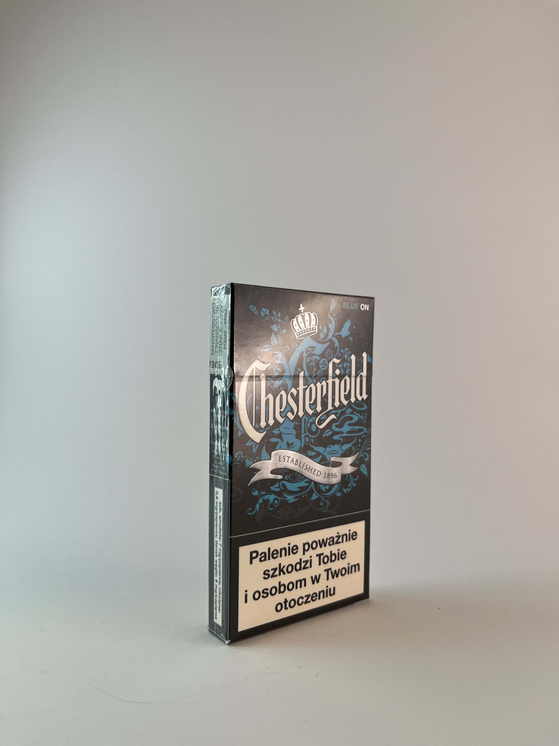 This is a pack of Chesterfield "Blue On" cigarettes from the special "Be Different" design series. The package is distinguished by a dark base and a dynamic blue ornament that surrounds the "Chesterfield" logo. This is a visually close alternative to the "Mint On" version, but this one is menthol-free, with "Blue On" labeling. The pack was intended for the Polish market, with clearly visible warnings and the original excise stamp. The package is intact, sealed.