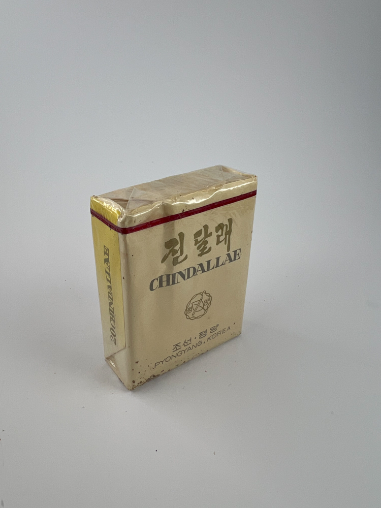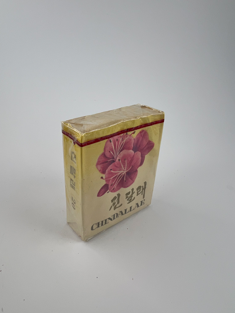 The Chindallae cigarette pack is one of the more visually appealing North Korean releases. The main side depicts a blooming azalea flower, which symbolizes spring in Korean culture. The background is light, almost yellowish, with red accents and gold lettering. The reverse side states the origin – „PYONGYANG, KOREA“. The package is sealed, but there are visible signs of rust and surface discoloration caused by storage.