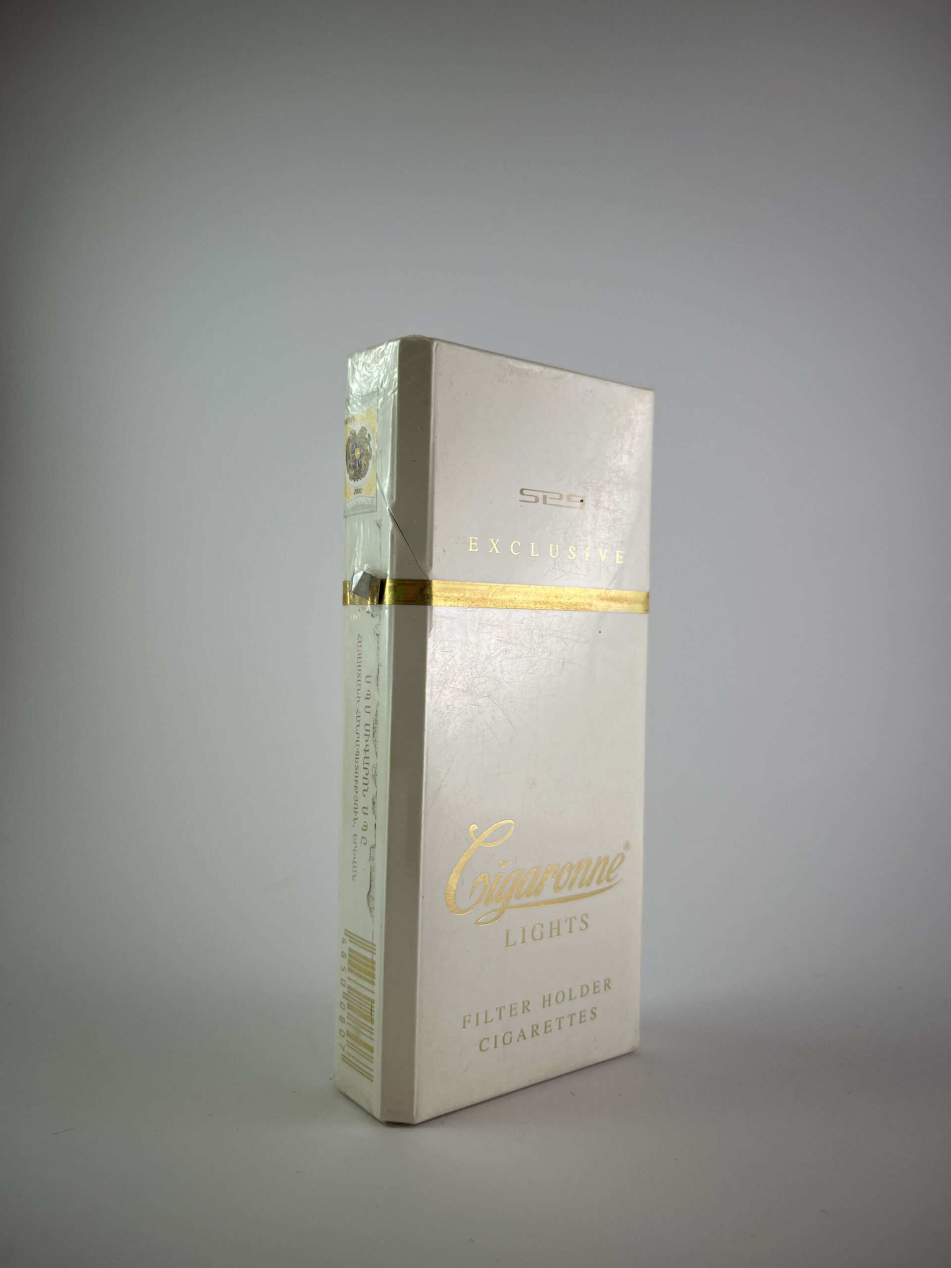 Description: This Cigaronne Lights pack is distinguished by its luxurious design and the combination of gold and white colors, conveying elegance and exclusivity. The pack is made with special attention to detail, emphasizing the premium status of cigarettes. On the back, information is provided about the innovative production technology that allows you to enjoy lighter smoking. Subtly embossed details and accents attract attention. The warning about the harm of smoking is provided in Russian.