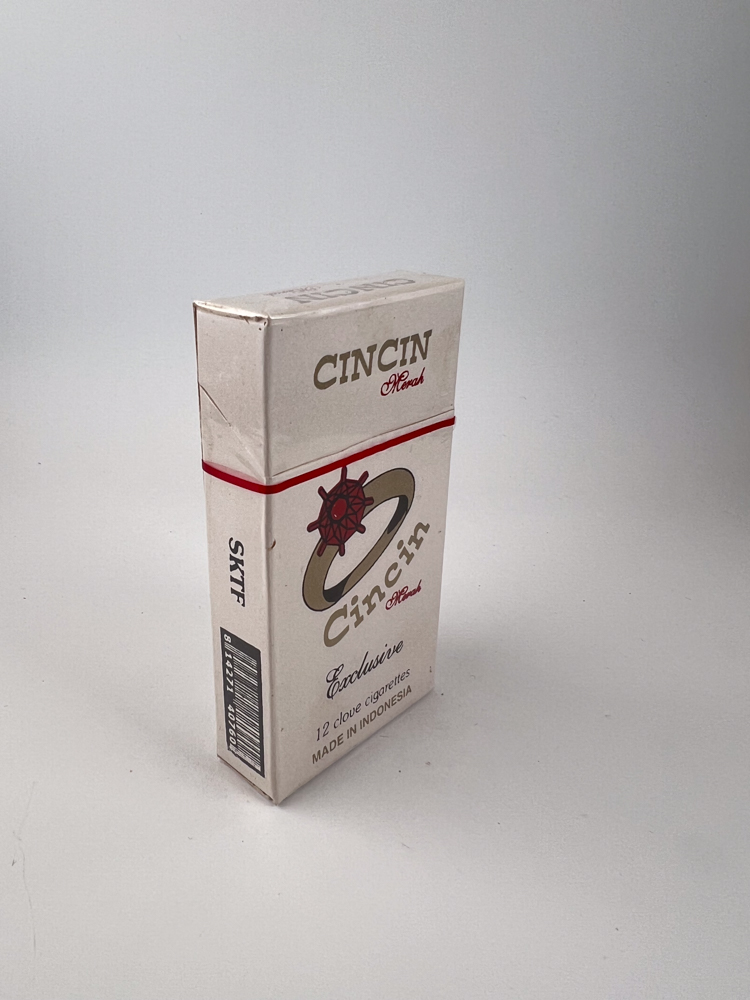 „"Red Ring" (lit. Red ring) – this traditional Indonesian kretek cigarette a brand with a subtle, classic design. The front side is clearly dominated by the logo – gold ring with red steering wheel, symbolizing the balance between tradition and maritime aesthetics. The name "Cincin" is printed in a classic font, and below it - the red signature "Merah".