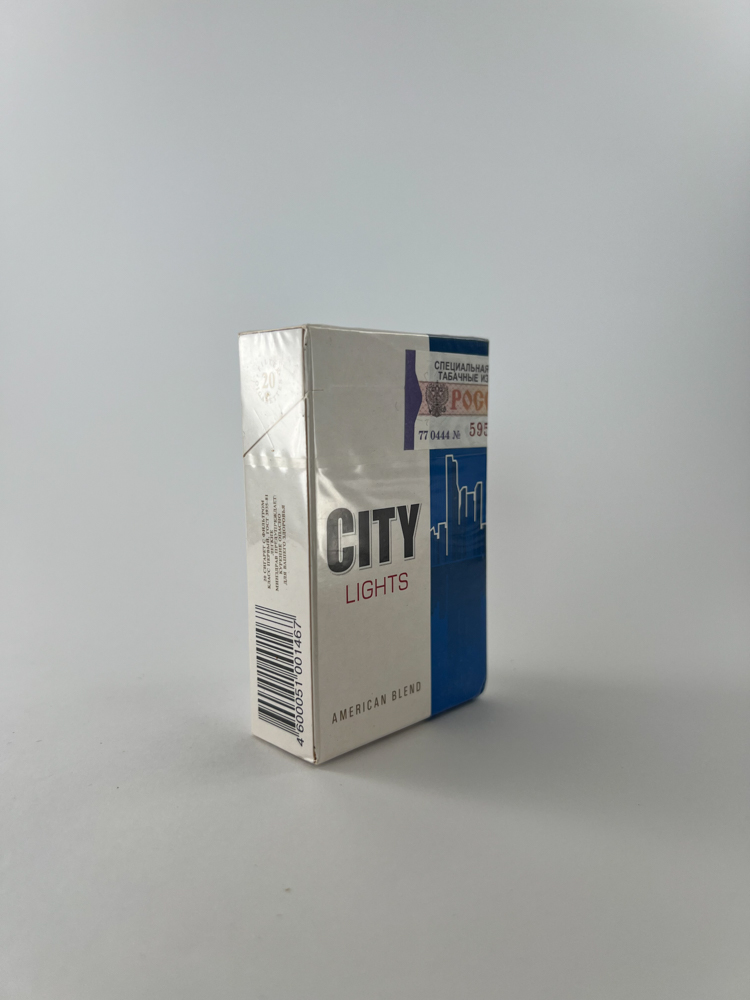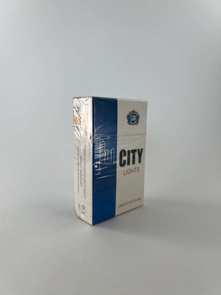 Description: „City Lights“ is a cigarette pack under the LD brand, featuring a modern, minimalist design with the outlines of city skyscrapers. The white and blue color scheme conveys an image of lightness, and the „Lights“ name refers to the lighter nicotine and tar content. The LD emblem visible on the pack confirms its affiliation with the well-known brand line, which was widely distributed in Eastern European markets. Packs of this model were often aimed at middle-class consumers.