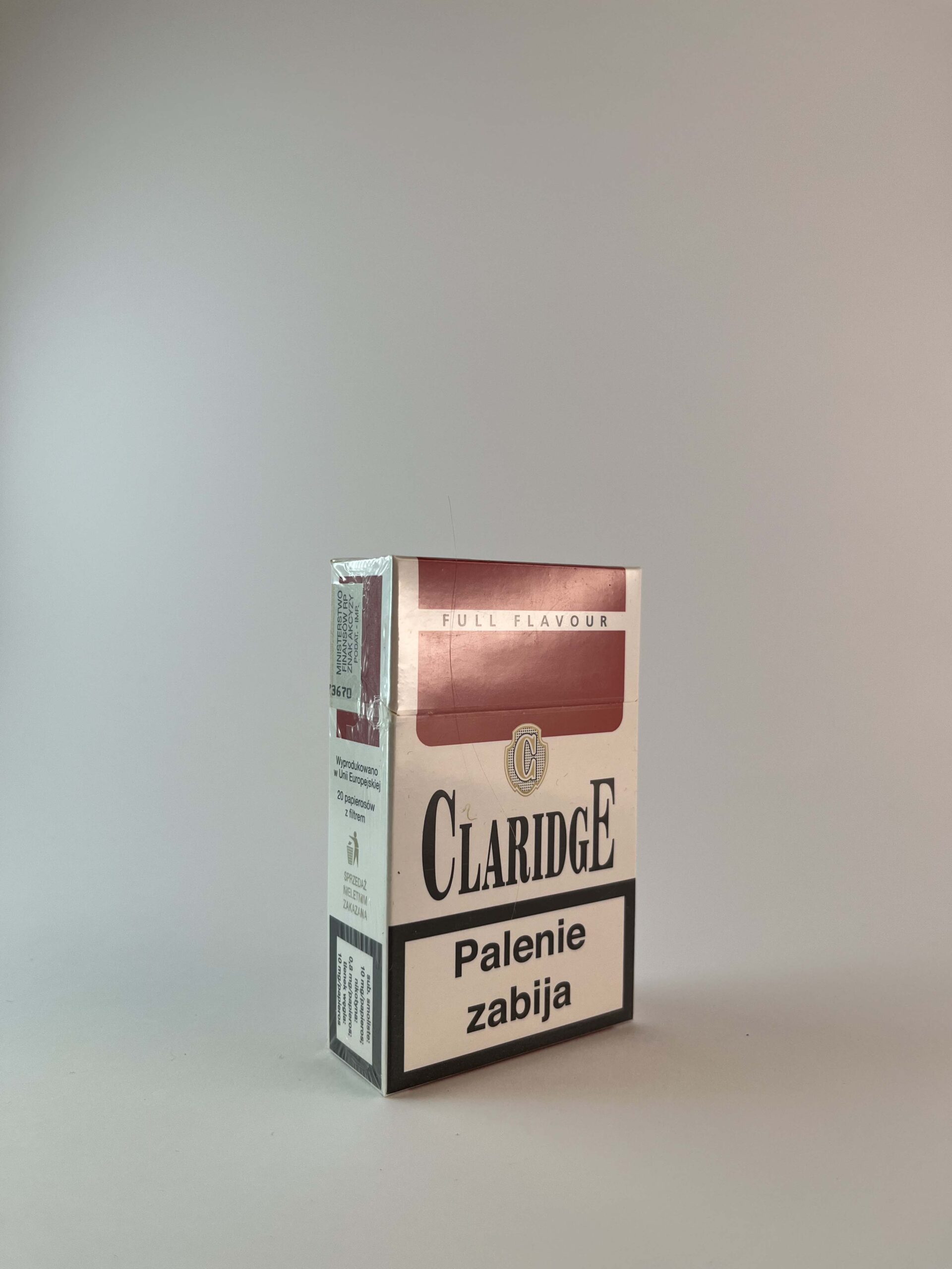 Claridge's "Full Flavour" is a classic cigarette pack, featuring a simple red and white design with a dominant logo in the center. The warnings are in Polish, indicating that the pack was intended for the Polish market. At the top is the inscription "Full Flavour", meaning full flavor, which is typical of stronger cigarettes. The packaging is glossy, neatly sealed, and not folded.