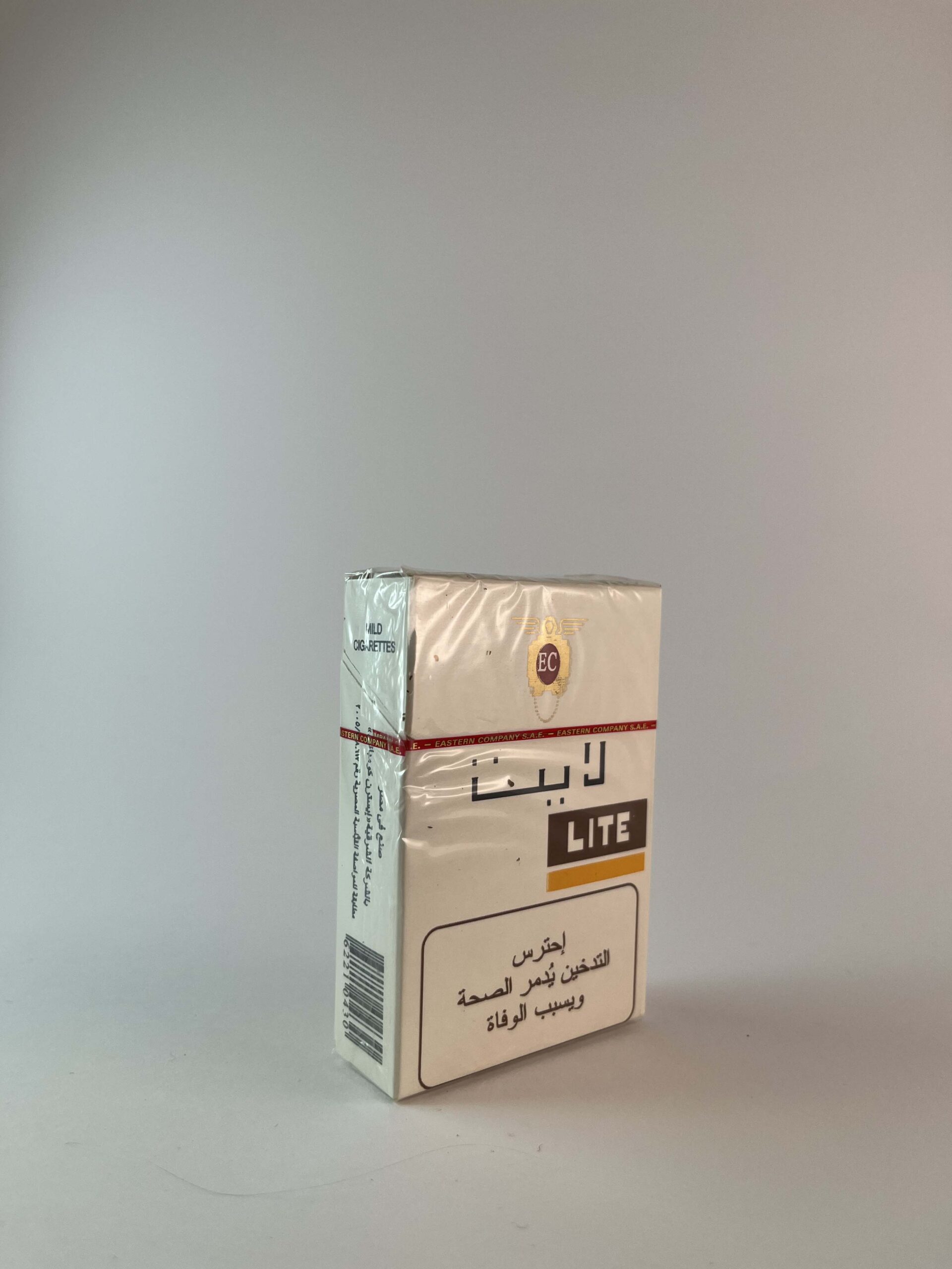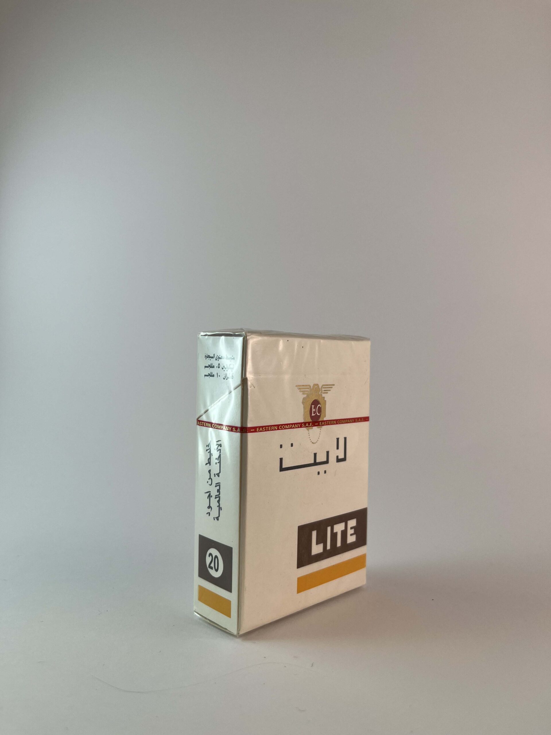 Description: The Cleopatra Lite cigarette pack features a simple and minimalist design with a white background and subtle yellow accents. The Cleopatra brand is well-known in Egypt and the Middle East. The health warning is presented in Arabic, highlighting the potential negative health effects.