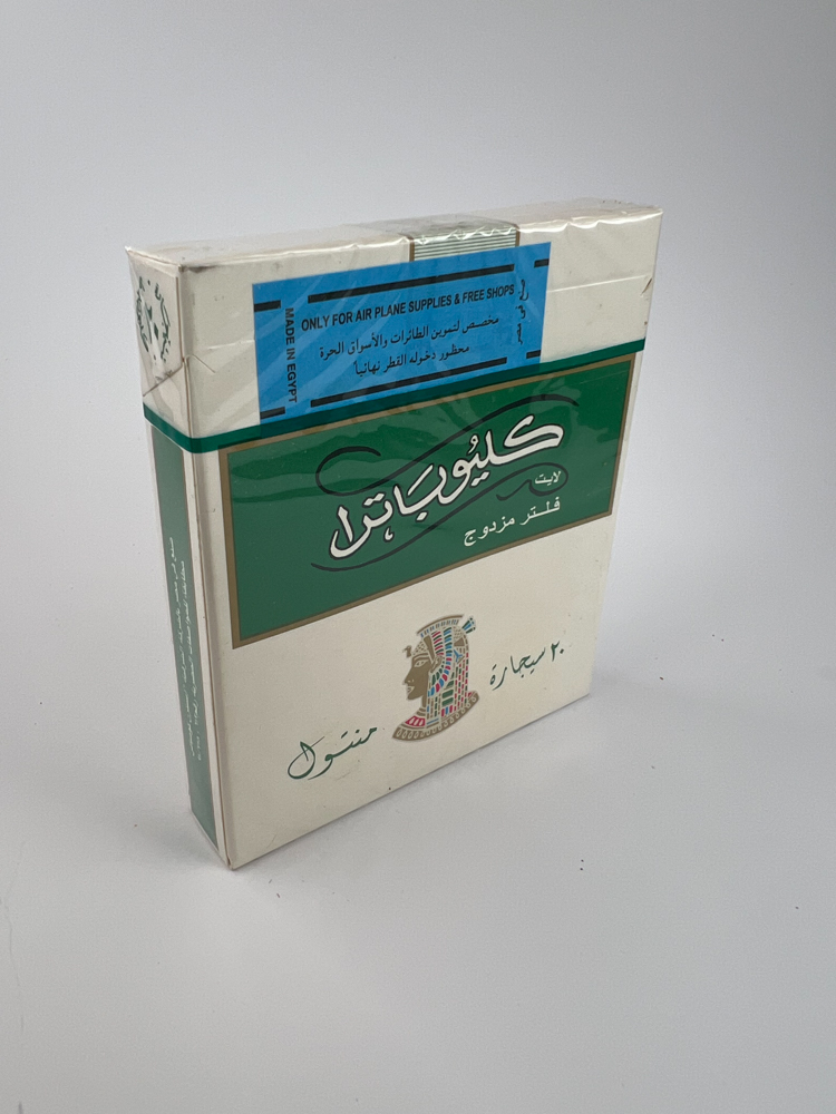 „Cleopatra Menthol is a classic Egyptian cigarette brand for export and airport duty-free shops. The pack is decorated in a white and green color scheme with the iconic silhouette of Queen Cleopatra covered in colorful symbols. The front side uniquely identifies the menthol flavor, and the top side states that these are Dual Filter Light cigarettes. A blue sticker on the back indicates that this pack is intended for airplanes and Duty Free stores only ("ONLY FOR AIRPLANE SUPPLIES & FREE SHOPS"). The text is in English and Arabic.