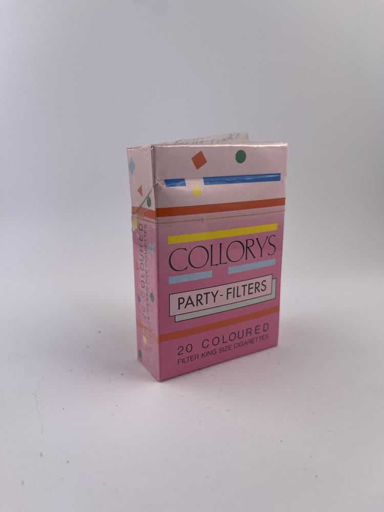 One of the most visually and conceptually "fun" packages from the late 1980s. Collorys Party Filters stands out with its bright, pastel colors of pink, yellow, blue and green. The name is printed on the front COLLORYS above a strip structure with playful geometric elements: triangles, circles and rectangles, which recall the Memphis design aesthetic of that era.