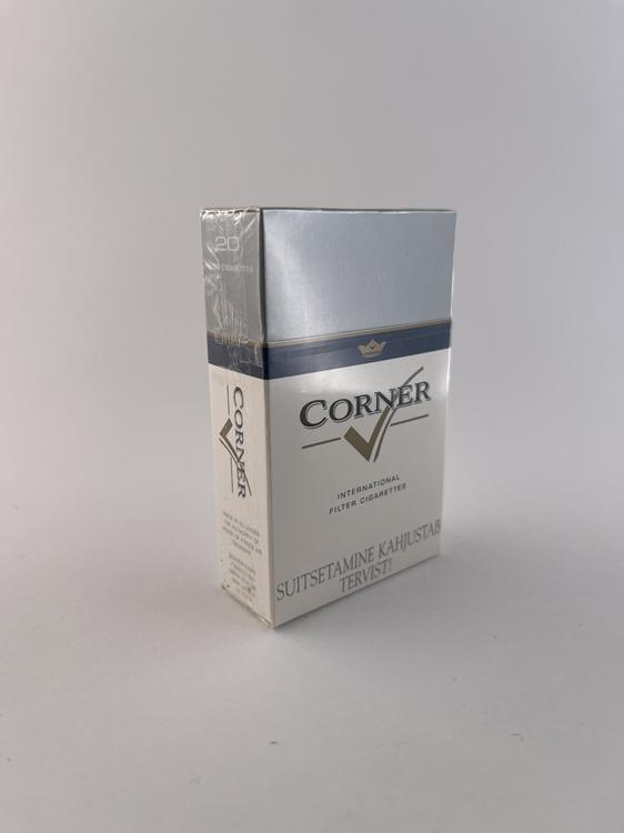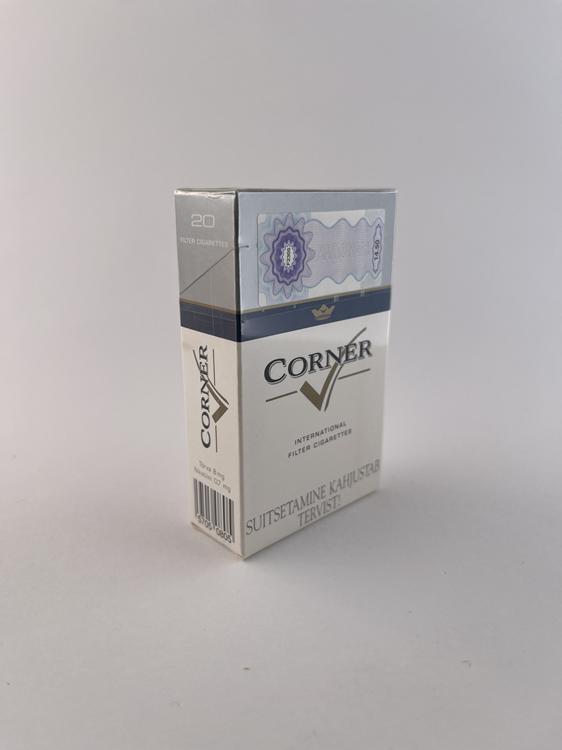 Description: The Corner cigarette pack features a minimalist and restrained design typical of the transition period after the collapse of the Soviet Union in the Baltic States. The dominant color combination is light gray and silver with a subtle blue stripe and a gold accent in the logo. The Corner brand name is presented in an elegant, slightly slanted font, giving the impression of modernity. The warning in Estonian at the bottom of the pack („Suitsetamine zaštētab tervist“) confirms the regional origin. The overall design reflects an attempt to create a Western-style product during the early market economy period.