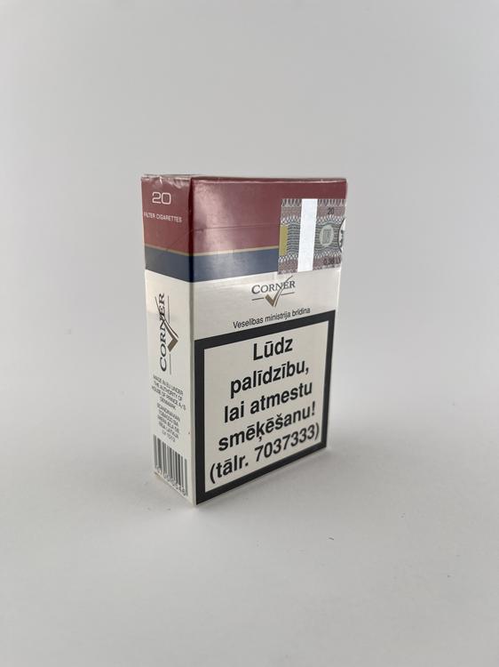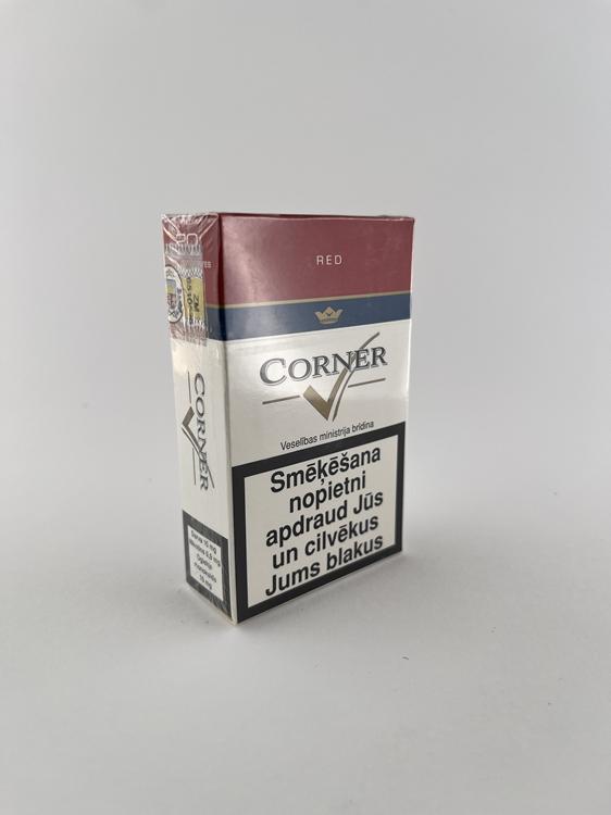 Aprašymas: Šis CORNER „Red“ cigarečių pakelis pasižymi klasikiniu baltos ir tamsiai raudonos spalvos dizainu su siaura mėlyna juosta per vidurinę dalį. Priekinėje pusėje išryškintas „CORNER“ logotipas su stilizuotu ženklu bei užrašas „International Filter Cigarettes“. Šis konkretus variantas skirtas Latvijos rinkai, ką patvirtina latviški sveikatos įspėjimai ir akcizo banderolė. Dizainas išlaiko paprastą, funkcionalų stilių, būdingą ekonominės klasės cigaretėms. Pakelis vizualiai tvarkingas, forma išlaikyta, plėvelė nepažeista, bendras išsilaikymas geras.