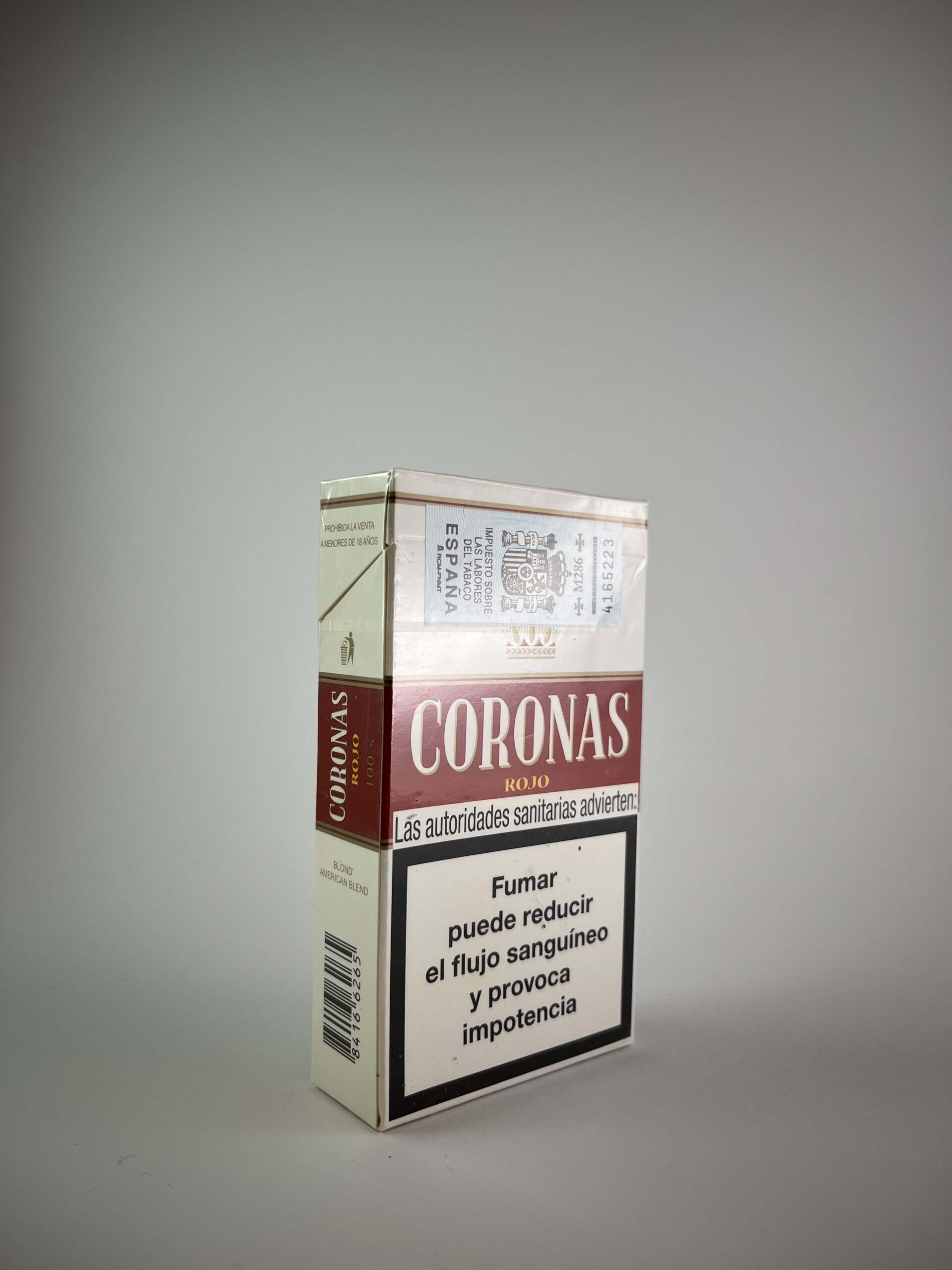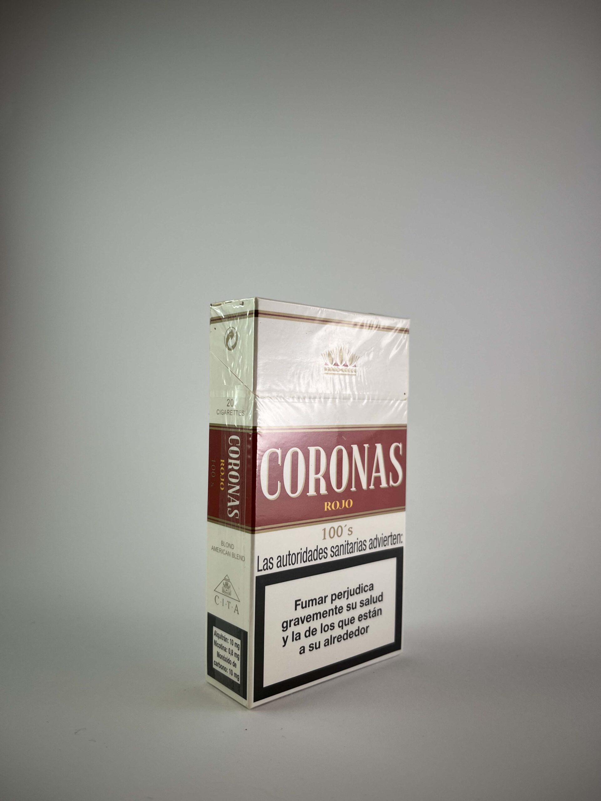 Coronas Rojo 100's is a classic cigarette pack for lovers of premium tobacco. The design is distinguished by its simple yet elegant appearance that attracts the attention of collectors. The red accent, combined with the brand logo, conveys an impression of quality and tradition. Warnings about the dangers of smoking are prominently displayed, drawing attention to the health risks.