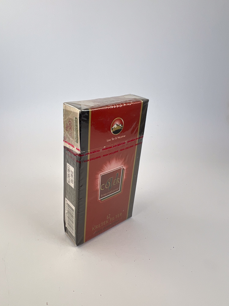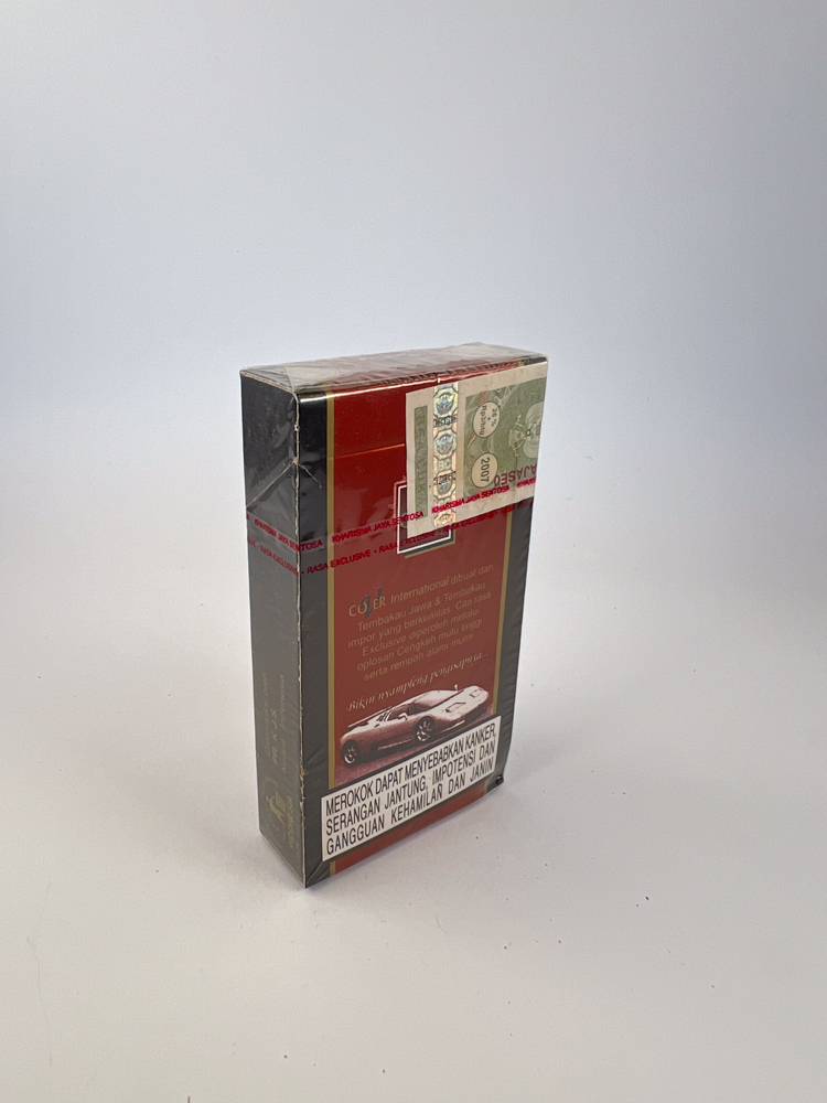 Coster International – modernios išvaizdos kretek cigarečių pakelis, išsiskiriantis sportišku ir dinamišku įvaizdžiu. Priekinėje pusėje dominuoja tamsiai raudonas fonas su subtiliais juodais kraštais ir auksinėmis detalėmis. Pagrindinis logotipas – Coster International – pateiktas minimalistiniame stačiakampyje, primenančiame automobilių markės emblemas.