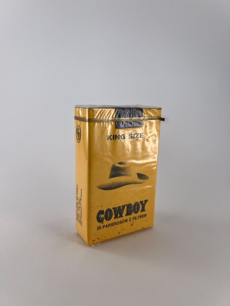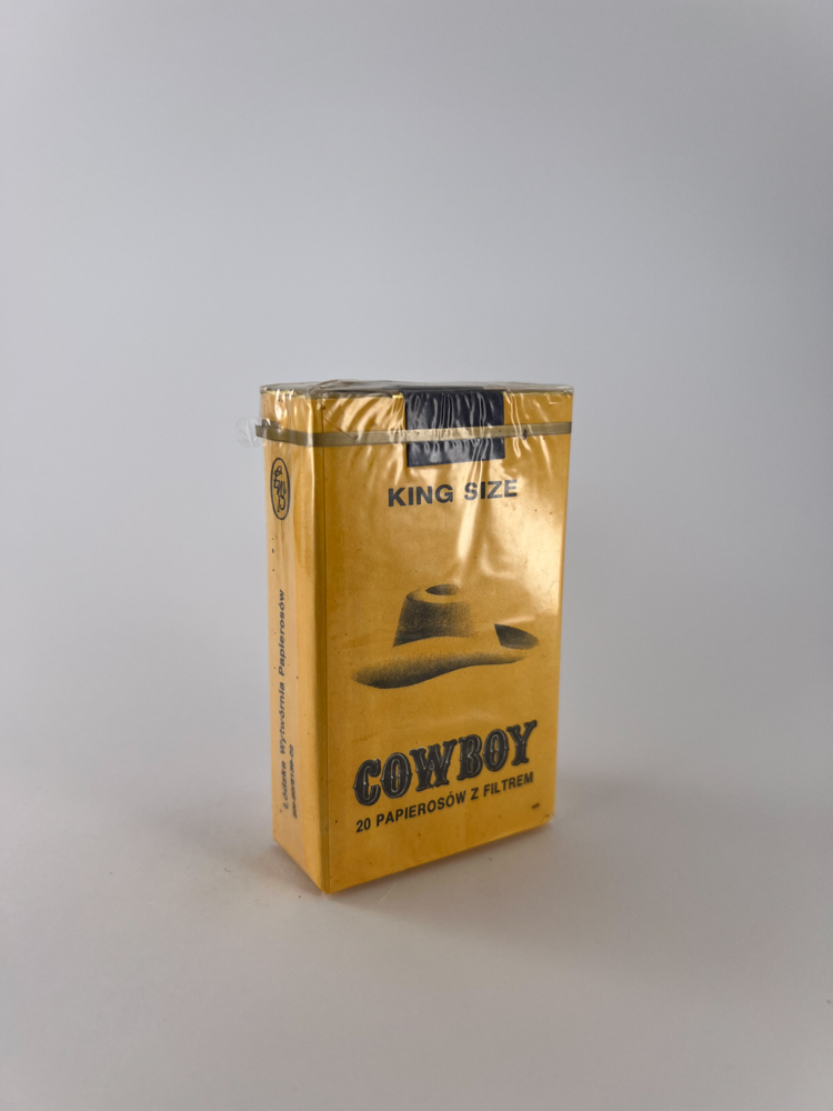 This pack of Cowboy cigarettes is a typical product of the late socialist period in Poland. The yellow background, black minimalist design with an illustration of a cowboy hat and the name "COWBOY" evoke the image of the West, which was exotic and attractive at the time. The inscriptions "20 papierosów z filtrem" (20 cigarettes with filter) and "King Size" testify to the fact that this was a premium segment product on the local market. The pack is made Łódzka Wytwórnia Papierosów, which was one of the main state-owned tobacco factories in Poland.