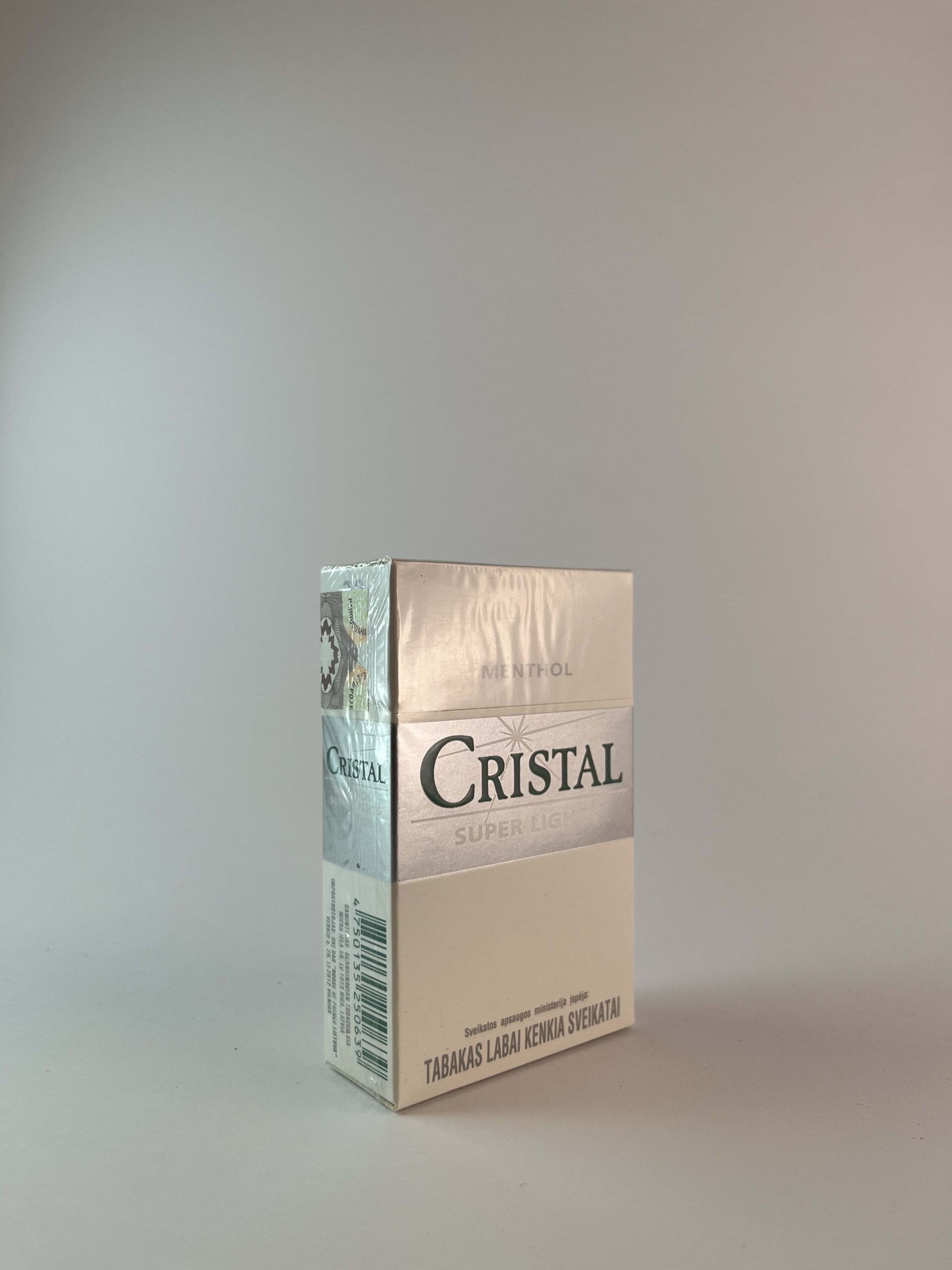 Description: The Cristal Super Lights Menthol cigarette pack has a light, modern look with subtle greenish and silver elements that emphasize the lightness and freshness of the product, characteristic of menthol cigarettes. The pack clearly displays health warnings in Lithuanian, warning about the dangers of smoking. The pack design is minimal, maintaining the purity and elegance that is suitable for modern smoking products.