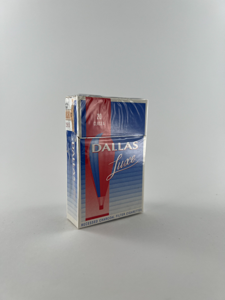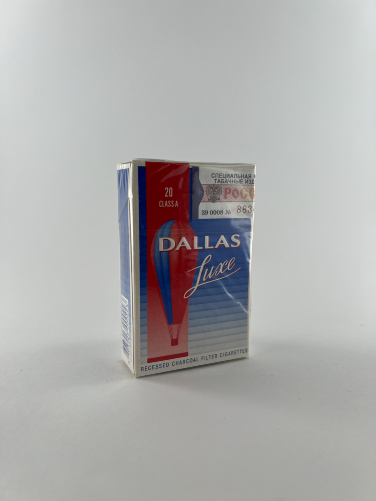 „DALLAS Luxe“ – tai įdomus ir gana retas pakelis su ryškiu retro dizainu. Priekinė dalis vaizduoja oro balioną, kuris įrėmintas raudoname fone, o pavadinimas „DALLAS Luxe“ parašytas stilingu šriftu. Pakelis turi angliškus užrašus – “Recessed Charcoal Filter Cigarettes” and “20 Class A”, kurie rodo orientaciją į tarptautinę estetiką. Visgi ant viršaus išlikęs rusiškas akcizo ženklas „РОССИЯ“ patvirtina, kad pakelis buvo skirtas vidaus rinkai. Būklė – nepriekaištinga: nepažeistas, originali plėvelė, akcizo lipdukas vietoje.