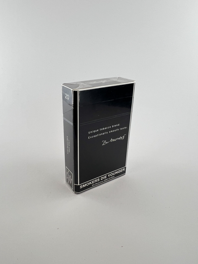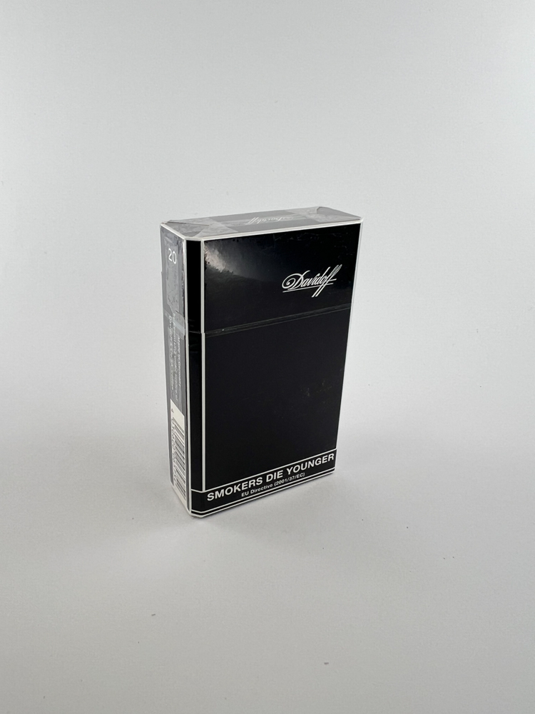 Description: The Davidoff Black cigarette pack has a very minimalist design - a matte black background with a white logo and subtle details. At the bottom of the front and back sides there is a white warning in English "Smokers die younger", supplemented by a reference to the EU directive (2001/37/EC), indicating that this release is intended for the European Union market. On the back side there is the phrase "Unique tobacco blend. Exceptionally smooth taste" with the signature of Zino Davidoff. The pack is undamaged, tightly packed in the original cellophane.