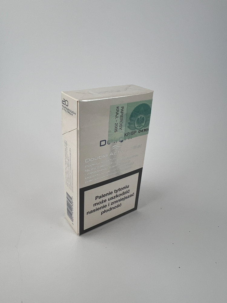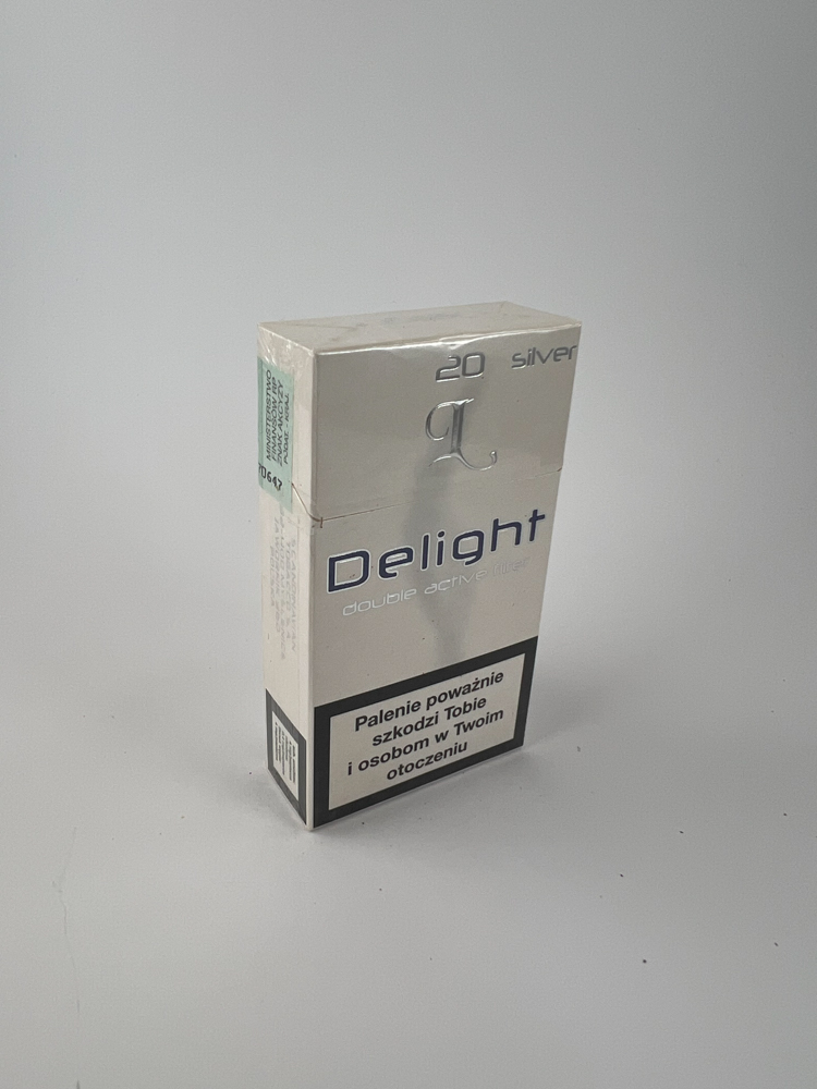 Description: „Delight Silver is a cigarette pack of Polish origin, the design of which is based on a light, minimalist style with a silver logo and the inscription "double active filter", indicating the filter technology. Warnings about the harm of smoking are presented in Polish, and the pack has a green excise strip with the date of issue - 2005. The pack is intended for the local market and is distinguished by a modern design of that era.