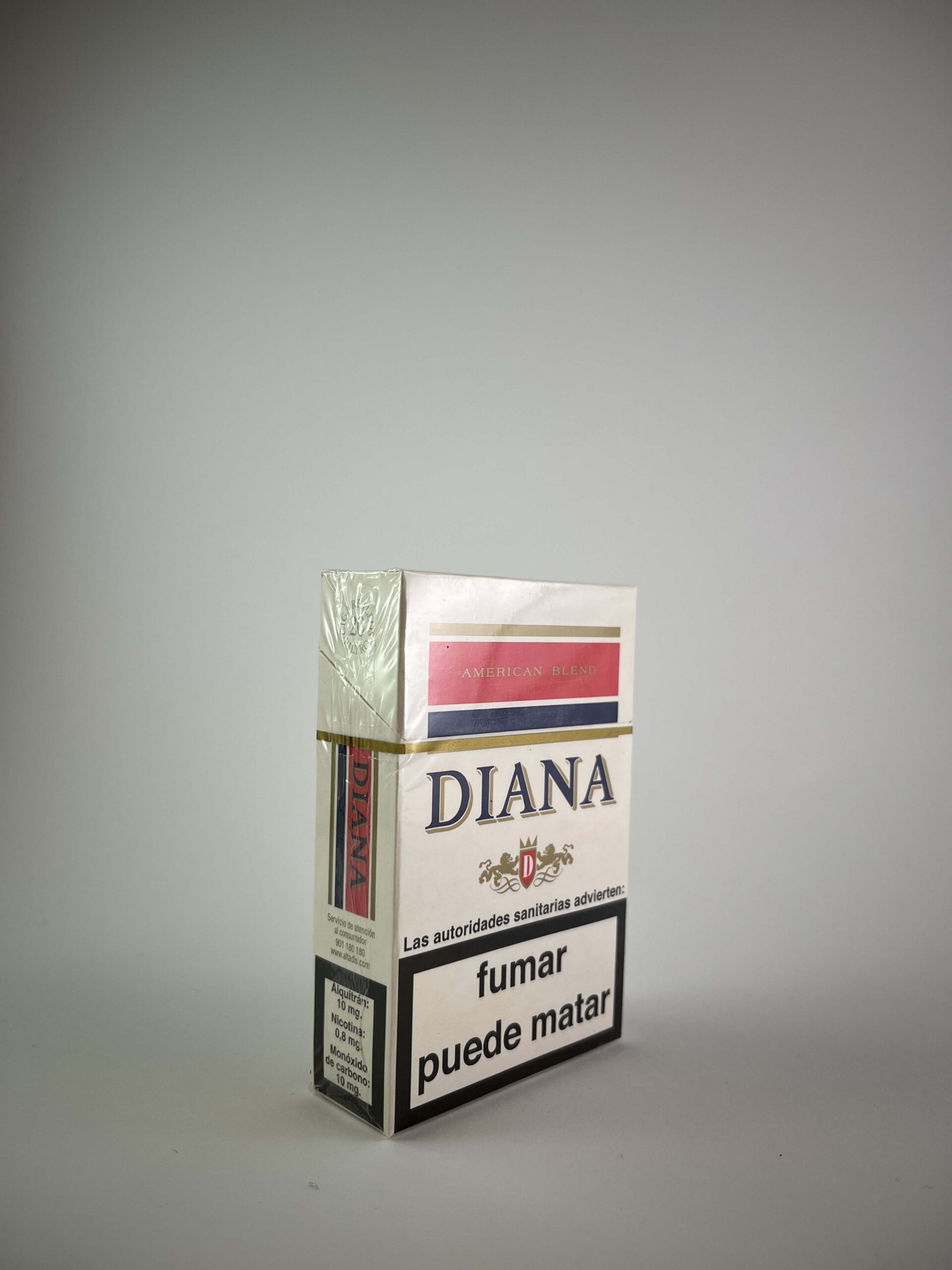 Description: This pack of Diana American Blend cigarettes features a simple yet clear design. The white background with red and blue accents emphasises the American style. The health warnings are in Spanish, indicating the market orientation towards Spain or another Spanish-speaking region. The pack is in perfect condition, with all original elements preserved, including the excise sticker. This indicates that the pack was intended for official trade.