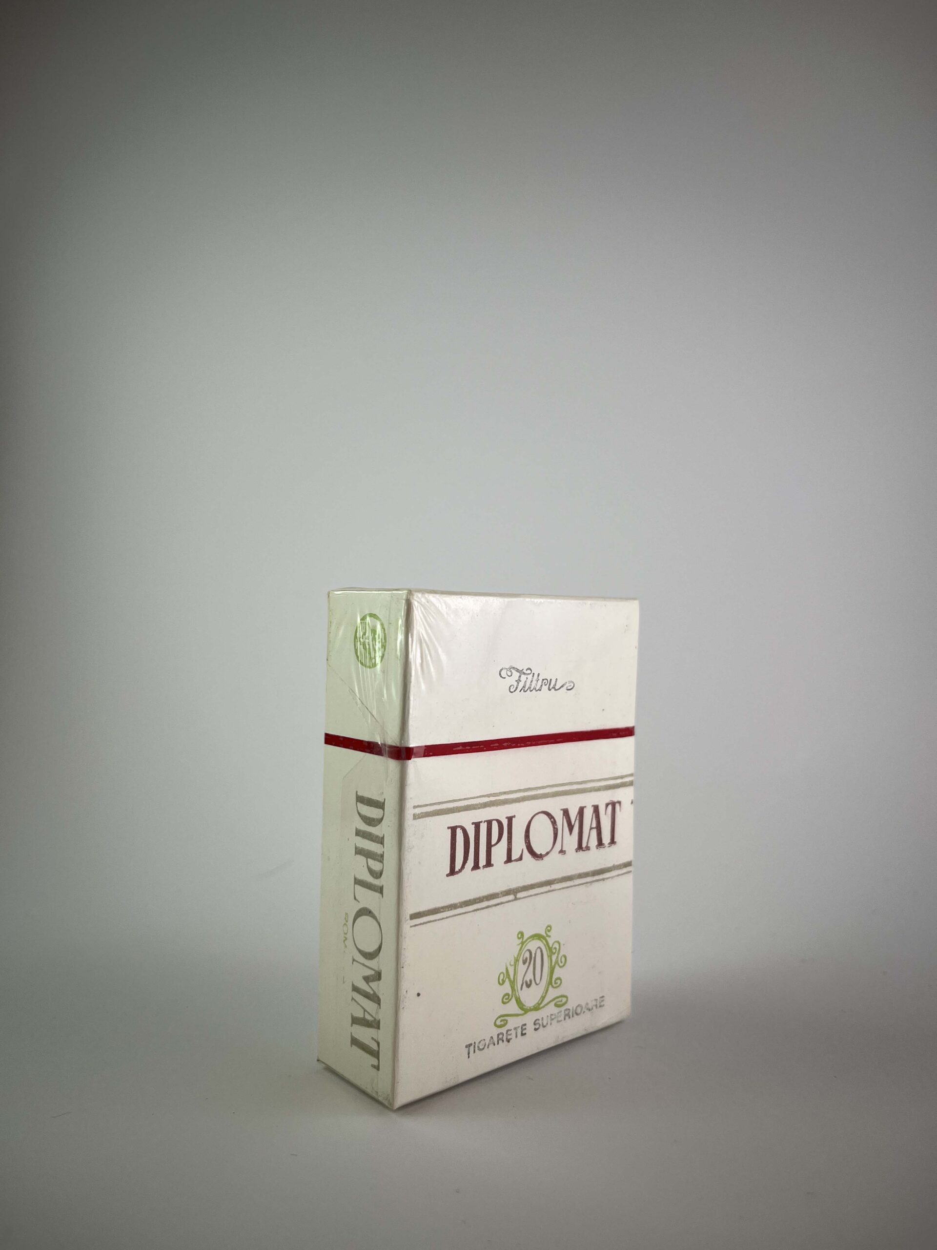 „The Diplomat cigarette pack features a classic and minimalist design, dominated by white with red and green accents. The name Diplomat is highlighted in large letters, while the phrase "Tigarete Superioare" (high-quality cigarettes) at the bottom reinforces the sense of luxury. The upper part has a subtle red line element that adds elegance. This pack reflects the vintage aesthetics of the Romanian tobacco market and is valuable for collectors looking for unique Central and Eastern European cigarette designs.