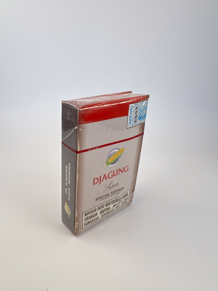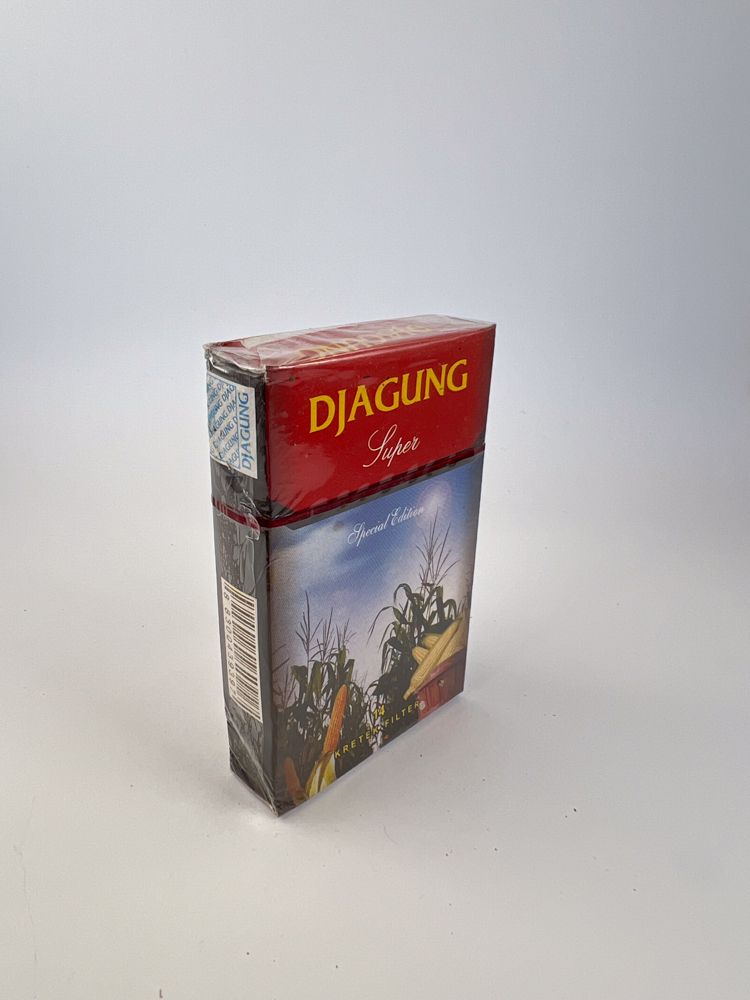 Djagung Super – this is one of the more interesting and visually distinctive kretek packages from Kudus, an Indonesian city considered kretek the birthplace of cigarettes. Name Djagung means "corn", so the corn symbol used in the center of the design is a reference to the natural, earthy, "local land" flavor.