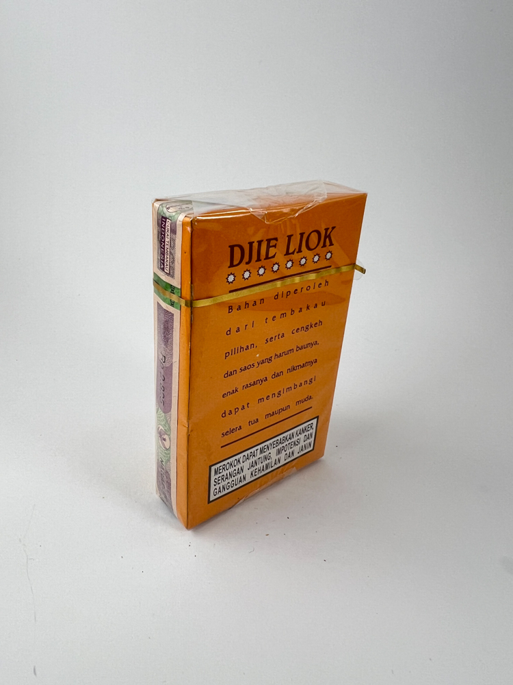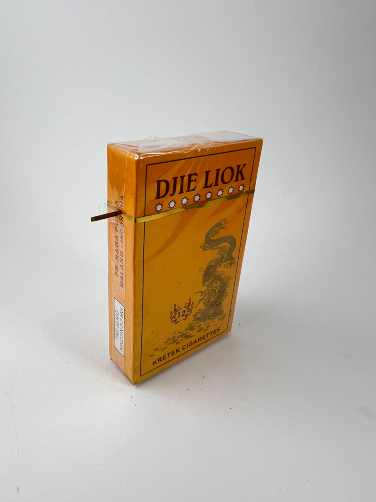 Aprašymas: Djie Liok yra tradicinis indonezietiškas kretek cigarečių pakelis, pasižymintis ryškia oranžine spalva ir kiniškos kultūros motyvais. Priekinėje pusėje vaizduojamas stilizuotas drakonas, kuris simbolizuoja stiprybę ir ilgaamžiškumą. Pavadinimas „Djie Liok“ pateiktas didelėmis raidėmis, o pakelyje yra 12 kretek cigarečių. Ant galinės pusės pateiktas aprašymas indoneziečių kalba, pabrėžiantis naudojamo tabako ir gvazdikėlių kokybę. Matomas originalus Indonezijos akcizo ženklas bei sveikatos įspėjimas apie rūkymo žalą. Nedidelės talpos (12 vnt.) formatas yra gana retas ir kolekcionierių tarpe vertinamas.