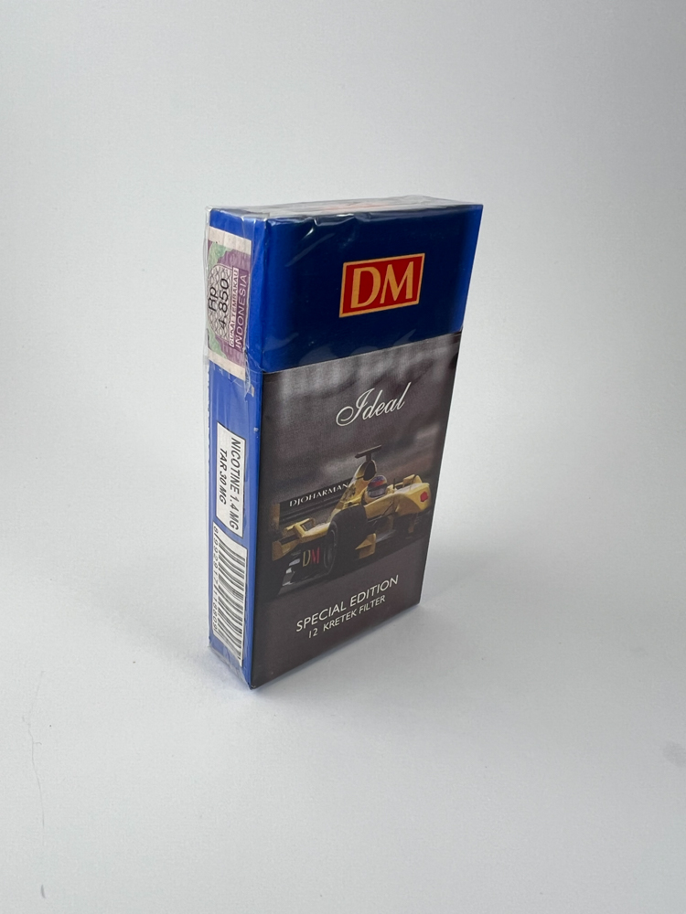 A limited edition pack of kretek cigarettes "DM Ideal Special Edition" made in Indonesia. The front part depicts a racing car, indicating the "Special Edition" series. The pack is designed for 12 cigarettes, has an emphasized sports theme and is intended for collector's purposes. The pack has an Indonesian excise stamp.