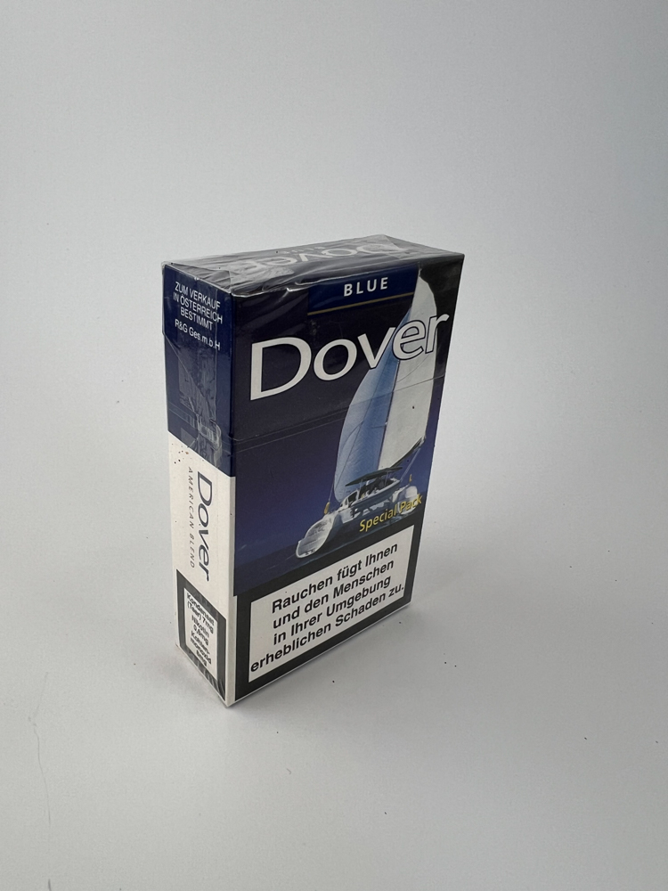 Description: The Dover Blue Special Pack cigarette pack features a nautical design – a sailing ship on a blue background on the front. This conveys the image of lightness and freshness that is associated with the „Blue“ type of cigarettes. The inscription „Special Pack“ at the top may indicate a limited or thematic edition. The warnings about the harms of smoking are in German, which indicates that the pack was intended for the Austrian market. The manufacturer is indicated on the sides – RAG Ges.mbH.